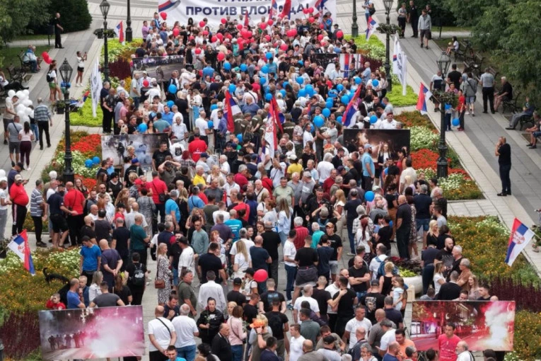 U Somboru večeras okupljeni građani nose balone u bojama zastave Srbije, a razvili su i transparente sa jasnim porukama protiv blokada.