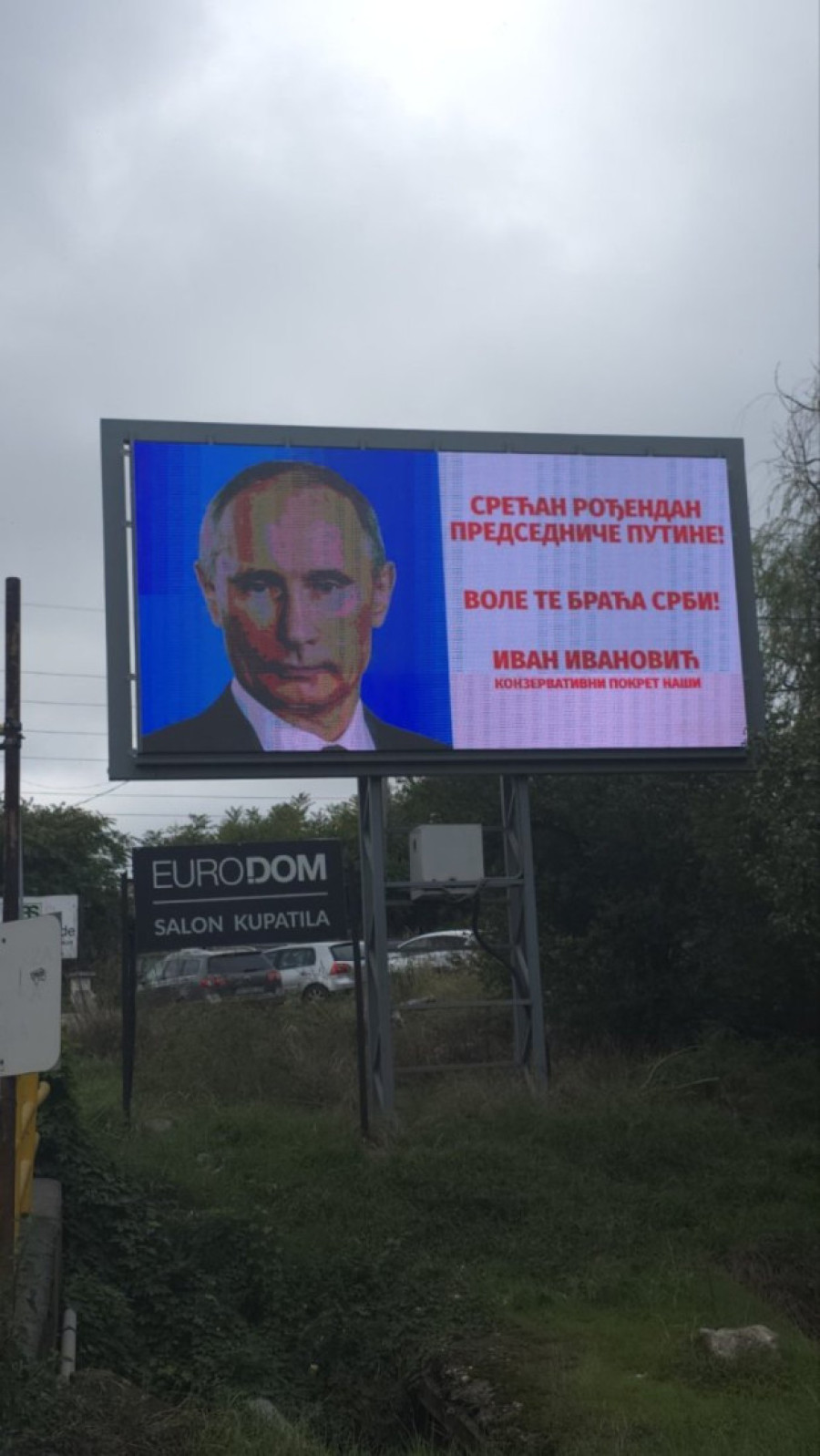 Konzervativni pokret NAŠI danas na bilbordima u Beogradu i Novom Sadu objavljuje rođendansku čestitku predsedniku Ruske Federacije Vladimiru Vladimiroviču Putinu, sa porukom: