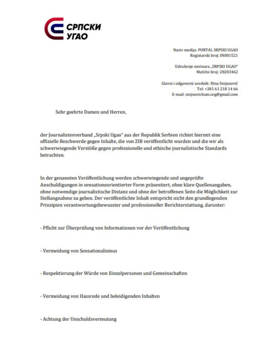 U pismu detaljno je opisano na koji način je prilog ZIB-a prešao granicu profesionalnog izveštavanja prenošenjem najtežih optužbi bez dokaza, oslanjanjem na jedan izvor bez kredibiliteta, izostankom odgovora napadnute strane i potpunim ignorisanjem načela pretpostavke nevinosti. Istaknuto je da se time "zloupotrebljava ugled javnog servisa ORF kako bi se publici predstavio jednostran, politički obojen i duboko neobjektivan sadržaj".