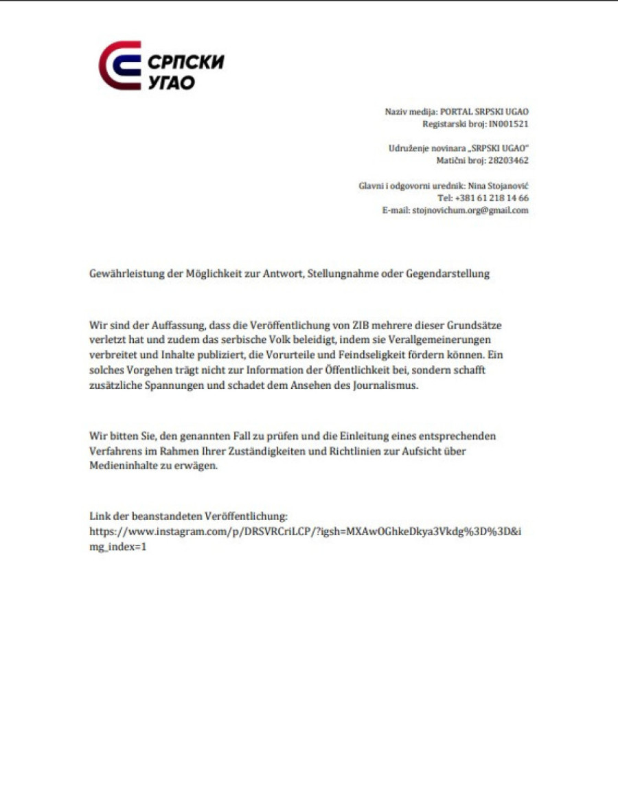 S obzirom na status ZIB-a kao dela ORF-a, nad kojim zakonski nadzor ima austrijska regulatorna vlast KommAustria, uz stručnu i operativnu podršku agencije RTR, Udruženje novinara "Srpski Ugao" odlučilo je da reaguje zvaničnim putem. Uputilo je pritužbu nadležnim telima za medije pri RTR / KommAustria, na adrese predviđene za žalbe i komunikaciju sa javnošću.