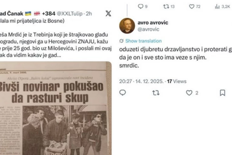 - Uglješa Mrdić je iz Trebinja koji je štrajkovao glađu u Beogradu, njegovi ga u Hercegovini znaju, kažu da je pre 25 godina bio uz Miloševića i poslali mi ovaj članak da vidim kakav je gad... - napisao je separatista Nenad Čanak.
