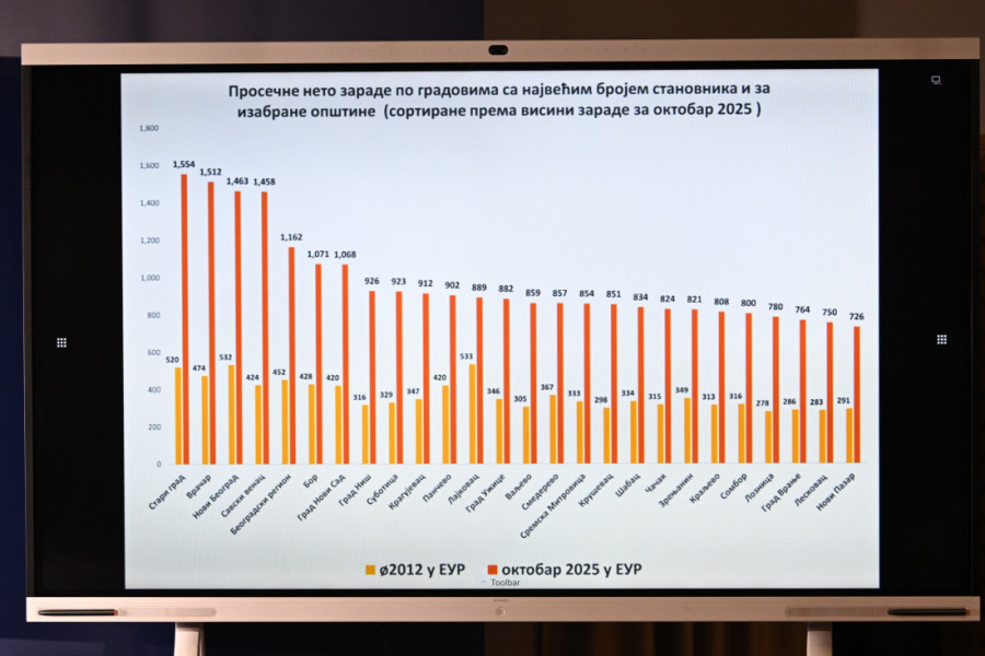 - Prosečna plata u oktobru mesecu za one koji nisu ispratili je zvanično 945 evra na nivou Srbije. Mi očekujemo da ona bude preko 1000 evra u decembru mesecu, u ovoj godini 2025. Dakle 2025. i verujemo da će biti u decembru 2026. mnogo veća. A da do kraja 2027. prosečna plata na nivou Srbije bude 1.400 evra, jer očekujemo veliki rast u naredne dve godine. Ono što je meni važno, povećali smo minimalne zarade, što nosi rizik.