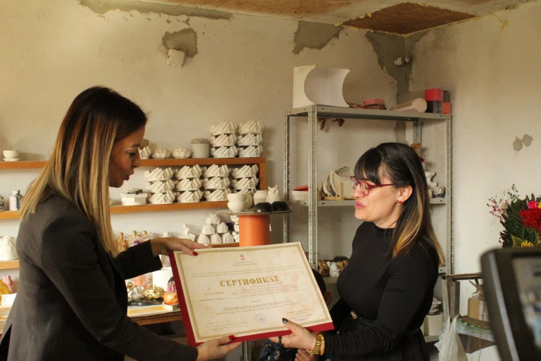 Ona je prilikom posete radionici PR za proizvodnju proizvoda od betona, gipsa, cementa "MIKA - GYPSUM CRVENKA" u Crvenki uručila vlasnici i preduzetnici Mirjani Karalić svečanu formu sertifikata za stare zanate.