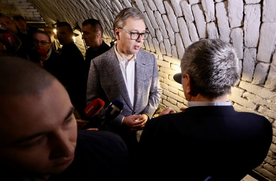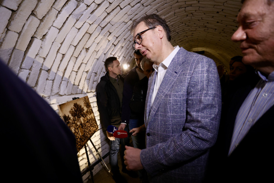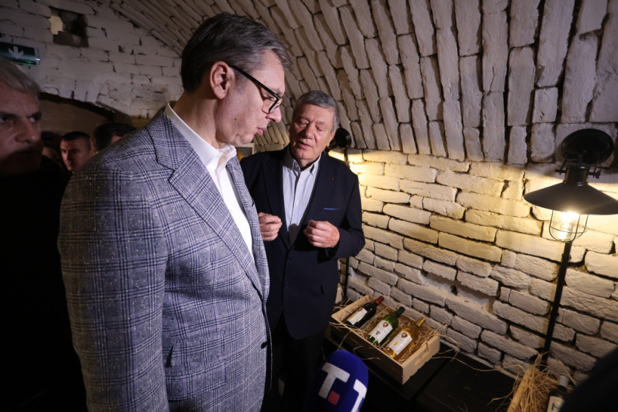 Predsednik Vučić je obišao i Vinske podrume, i interesovao se za istorijat tog objekta. Na žalbe novinara da se ne čuje ništa što govori, Vučić je kroz smeh uzviknuo: