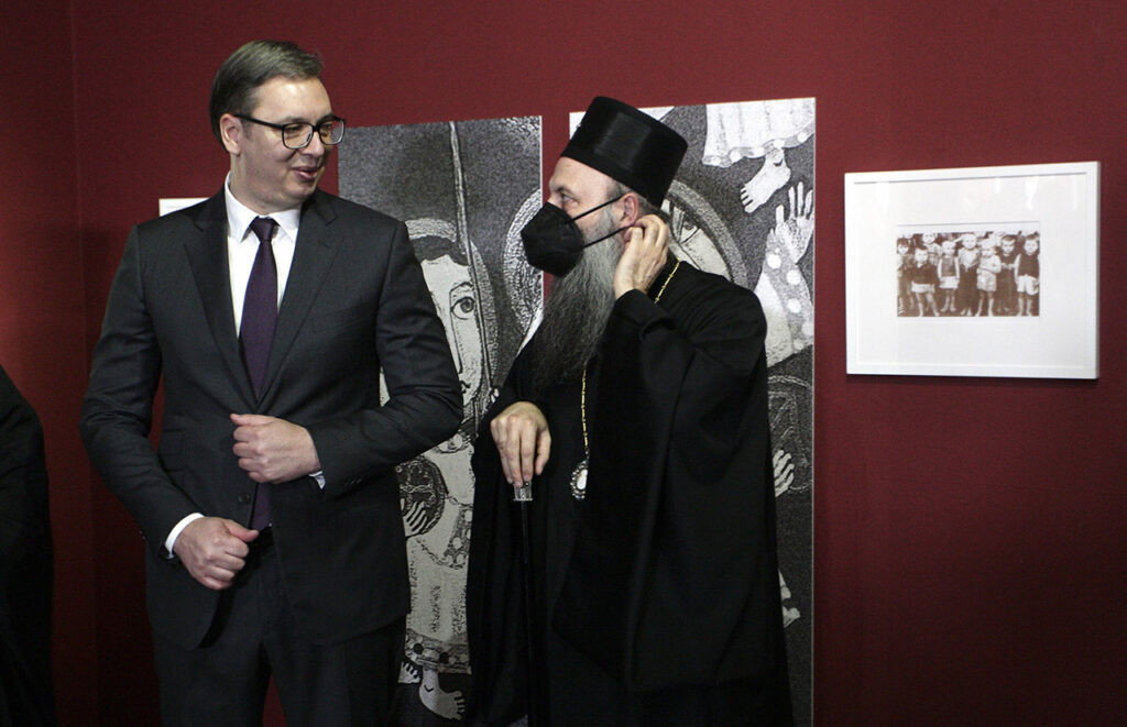 Beograd, 22. aprila 2021. – Izlozba “Sveti novomucenici jasenovacki u svetlosti Vaskrsenja” otvarena je veceras u Istorijskom muzeju Srbije, u prisustvu predsednika Srbije Aleksandra Vucica. Otvaranju izlozbe prisustvuju i patrijarh srpski Porfirije i ministarka kulture Maja Gojkovic. FOTO TANJUG/ SAVA RADOVANOVIC/ bg