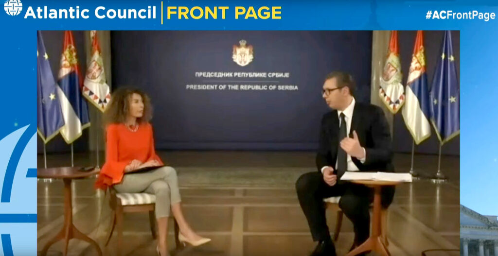 Predsednik Srbije Aleksandar Vučić putem video linka razgovara sa predstavnicima Atlantskog saveta o situaciji u vezi sa pandemijom COVID-19, kao i o regionalnim pitanjima i spoljnopolitičkim prioritetima zemlje.