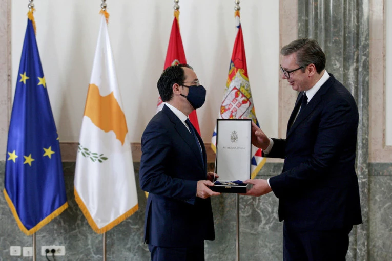 Predsednik Srbije Aleksandar Vučić uručio je danas ministru inostranih poslova Kipra Nikosu Hristodulidisu Orden srpske zastave prvog stepena.