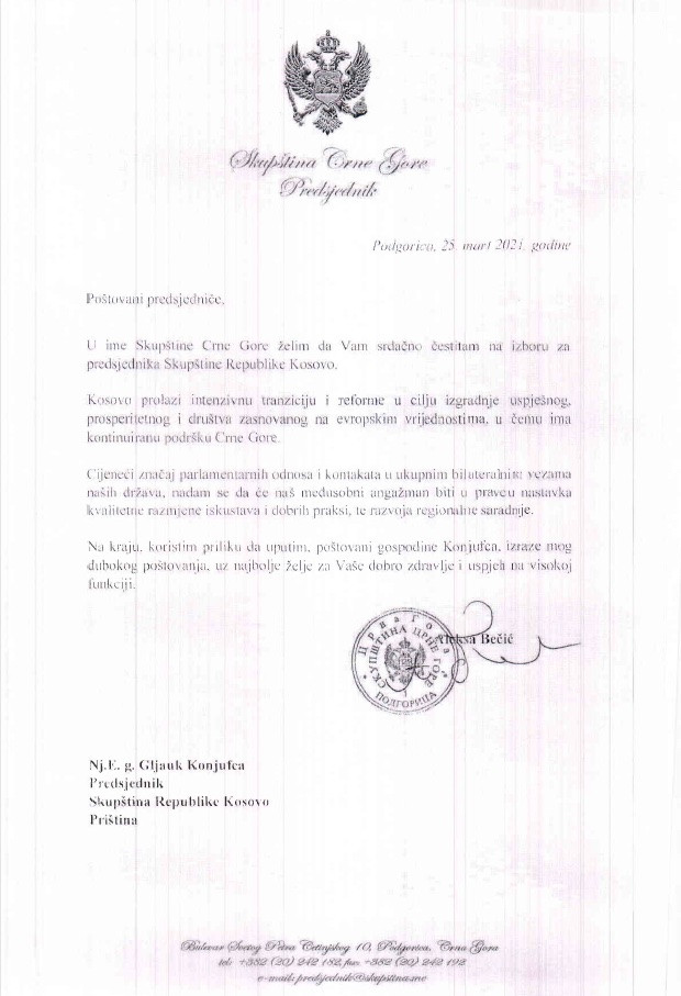 “U ime Skupštine Crne Gore želim da vam srdačno čestitam na izboru za predsednika Skupštine Republike Kosovo. Kosovo prolazi intenzivnu tranziciju i reforme u cilju izgradnje uspešnog i prosperitetnog društva zasnovanog na evropskim vrednostima u čemu ima podršku Crne Gore. Ceneći značaj parlamentarnih odnosa i kontakata u ukupnim bilateralnim vezama naših država, nadam se da će naš međusobni angažman biti u pravcu nastavka kvalitetne razmene iskustava i drugih praksi, te razvoja regionalne saradnje. Na kraju, koristim priliku da uputim, poštovani gospodine Konjufca, izraze mog dubokog poštovanja uz najbolje želje za Vaše dobro zdravlje i uspeh na visokoj funkciji”, navodi Bečić u čestitci.