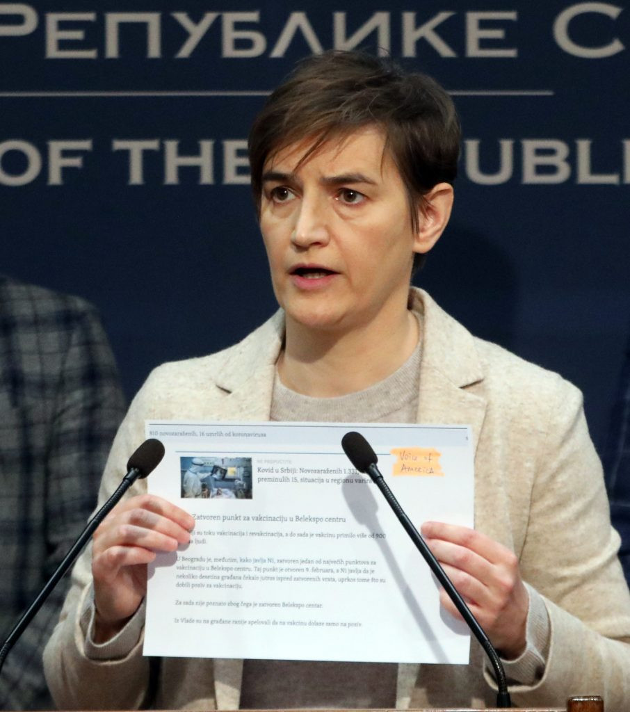 -Da li je ovo strašno zato što je Aleksandar Vučić nabavio vakcine? Moje je da ovaj proces branim i štitim hiljade i hiljade ljudi koji svaki dan daju sve od sebe, uključujući vikende i praznike. Ceo svet, od Nemačke preko Švajcarske do SAD i Velike Britanije, hvale ovaj proces – rekla je premijerka Srbije. – Kada su čuli da znamo da je ovo laž, u 15.48, nekih pet sati posle prve vesti, objavio je novu vest, koju sam jedva našla na sajtu, negde dole levo, da u Bel ekspo centru za danas nije bila planirana vakcinacija.
