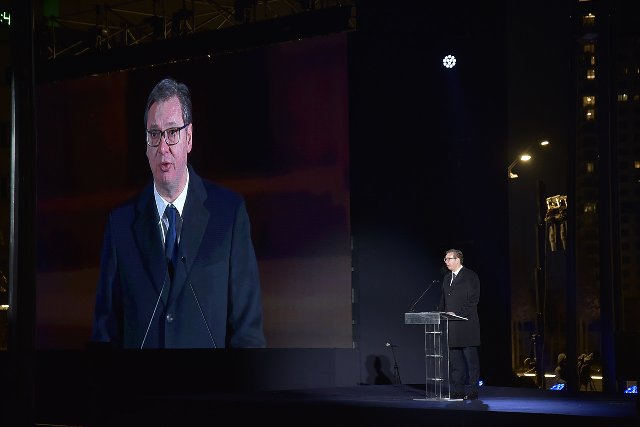 -Veliko hvala pokojnom patrijarhu Irineju – rekao je predsednik Srbije. –  Ona nas je bodrio da radimo važne stvare. Trudili smo se u prethodnih osam godina da našu Srbiju podignemo iz pepela, da je obnovimo, izgradimo nove puteve, pruge, škole i bolnice, ali više od svega pokušali smo da vratimo poštovanje i veru u sebe, svoje mogućnosti i snagu srpske države. I večeras, dragi narode, stojimo na mestu koje je neretko izazivalo stid svakoga od nas, na mestu koje je bilo neuređeno, prljavo i koje je predstavljalo sramotu, ne samo našeg grada, već cele zemlje.