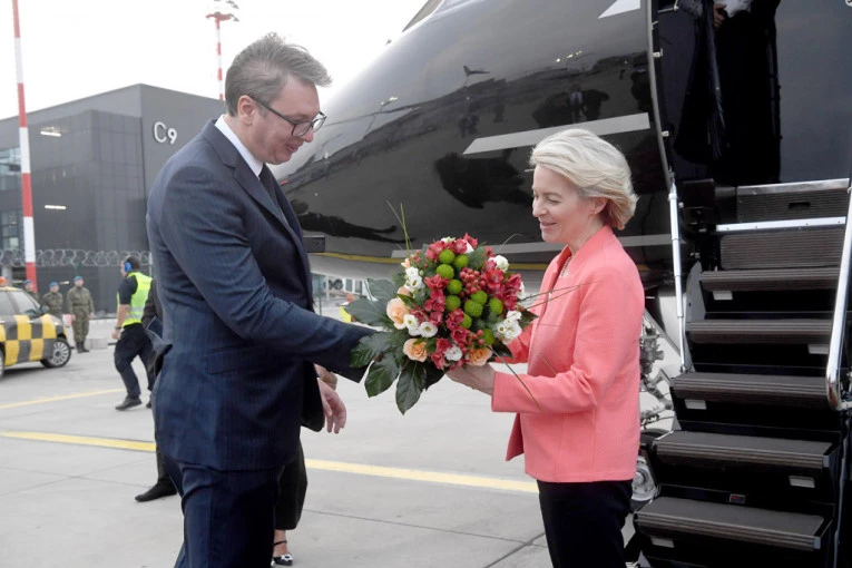 Predsednica Evropske komisije Ursula fon der Lajen doputovala je večeras u Beograd a na aerodromu ju je dočekao predsednik Srbije Aleksandar Vučić.