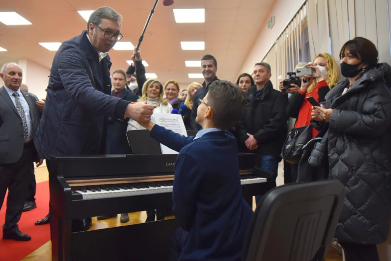 Prilikom posete predsednika Vučića doljevačkoj biblioteci Boško Aleksić (9) učenik drugog razreda muzičke škole odsvirao je numeru na klaviru.