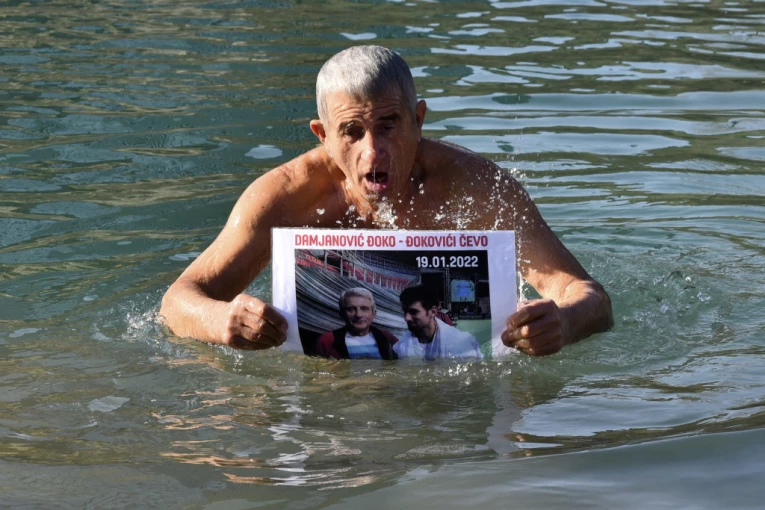 Starijeg, sedokosog čoveka je uhvatila kamera dok je izranjao iz vode držeću u rukama sliku na kojoj je srpski teniser Novak Đoković. koji je proteklih dve nedelje u žiži celokupne domaće, ali i strane javnosti zbog proterivanje iz Australije.