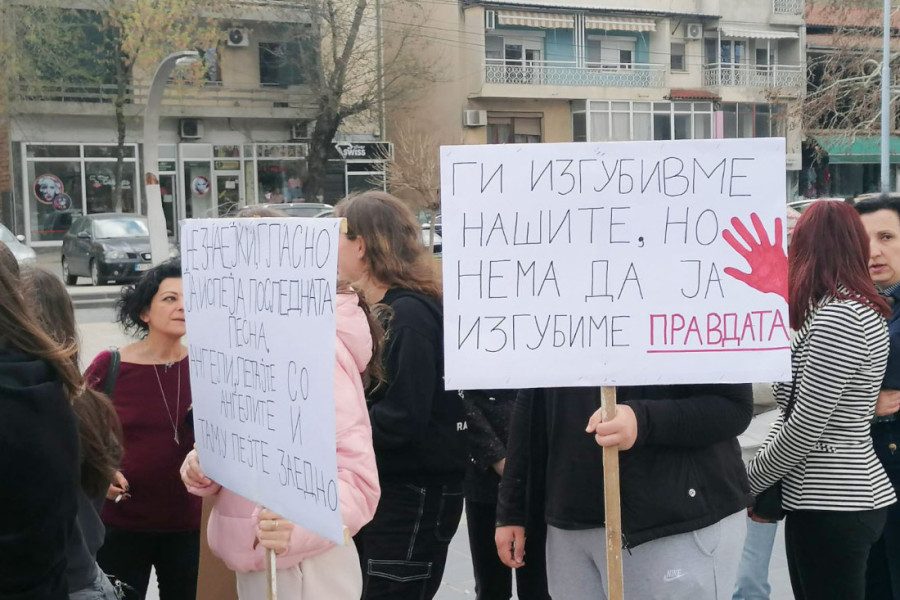Mi smo izgubili naše najrođenije, ali nećemo da izgubimo pravdu! Ovaj transparent drži tinejdžerka Angelina i u mimohodu čeka da se upiše u knjigu povodom smrti 59 osoba u diskoteci "Puls" u Kočanima. Kraj nje su i drugarice, drugovi.