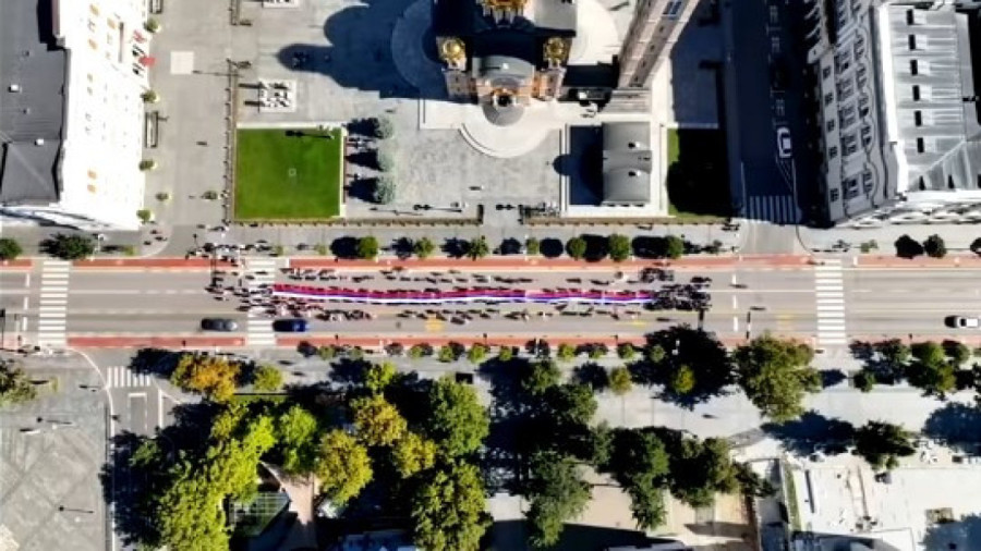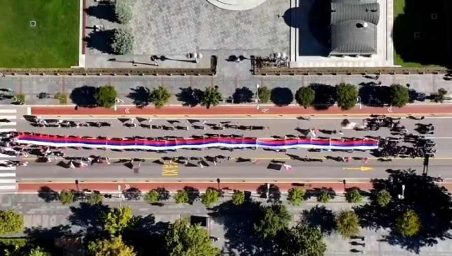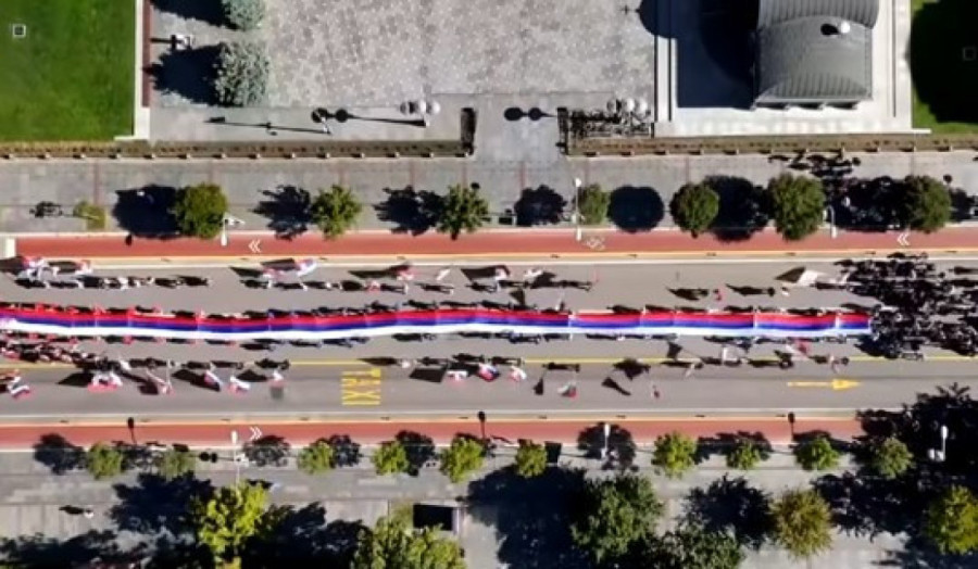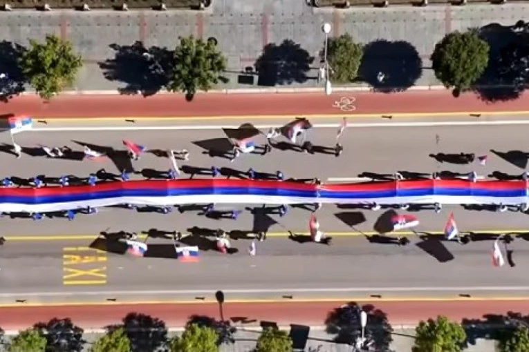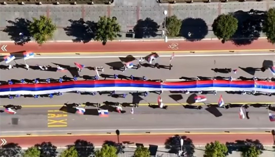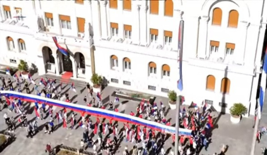 Ispred Palate Republike u Banjaluci je povodom današnjeg Dana srpskog jedinstva, slobode i nacionalne zastave istaknuta srpska trobojka duga 120 metara.
