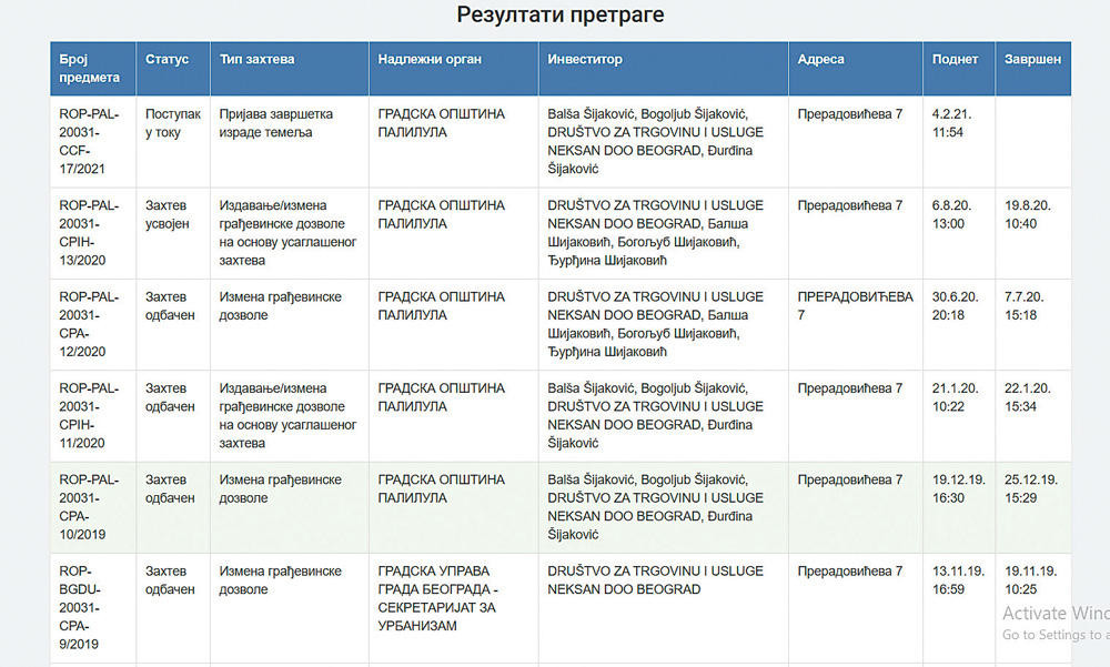 Prema podacima sa sajta opštine Palilula, firma Društvo za trgovinu i usluge „Neksan d.o.o.“ Beograd, Balša Šijaković, Bogoljub Šijaković i Đurđina Šijaković (svi navedeni kao investitori) grade objekat u Preradovićevoj 7.