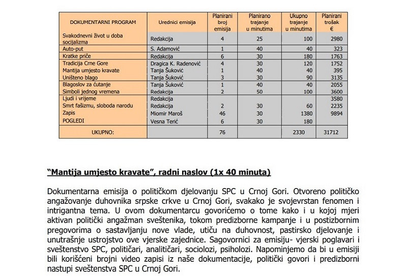Kako se može videti u javno dostupnom planu, dokumentarna redakcija ove televizije planira realizaciju sedam serijala i tri dokumentarne emisije, a autorka Tanja Šuković, koja je zajedno sa Snežanom Rakonjac potpisala “Svjedok Božije ljubavi”, emisiju koja je pokušala da diskredituje i omalovaži preminulog mitropolita crnogorsko-primorskog Amfilohija, najavljuje tri dokumentarca koja će se ponovo baviti srpskom pravoslavnom crkvom. Naravno, iz negativnog ugla.