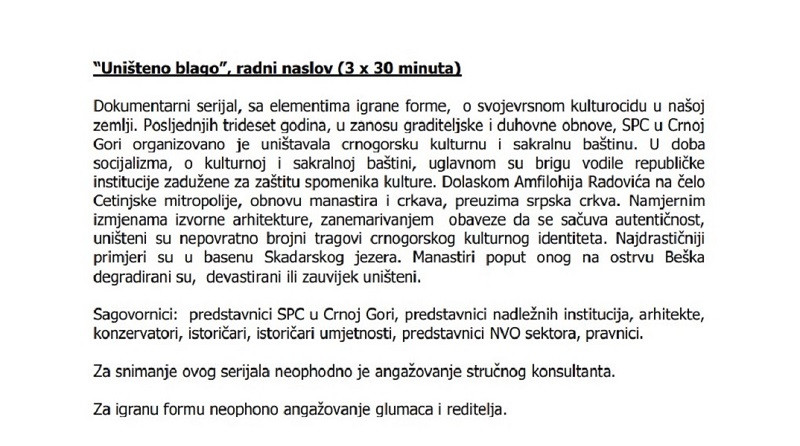 Dokumentarni serijal pod nazivom “Uništeno blago”, ima u planu da predstavi, kako su rekli u obrazloženju, kulturocid koji sprovodi SPC u Crnoj Gori.