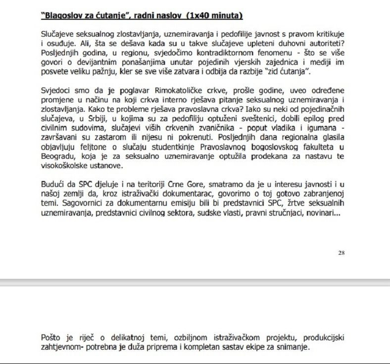 -Iako su neki od pojedinačnih slučajeva, u Srbiji, u kojima su za pedofiliju optuženi sveštenici, dobili epilog pred civilnim sudovima, slučajevi viših crkvenih zvaničnika – poput vladika i igumana – završavani su zastarom ili nisu ni pokrenuti. Poslednjih dana regionalna glasila objavljuju feljtone o slučaju studentkinje Pravoslavnog bogoslovskog fakulteta u Beogradu, koja je za seksualno uznemiravanje optužila prodekana za nastavu te visokoškolske ustanove. Budući da SPC deluje i na teritoriji Crne Gore, smatramo da je u interesu javnosti i u našoj zemlji da, kroz istraživački dokumentarac, govorimo o toj gotovo zabranjenoj temi, navedeno je u obrazloženju.