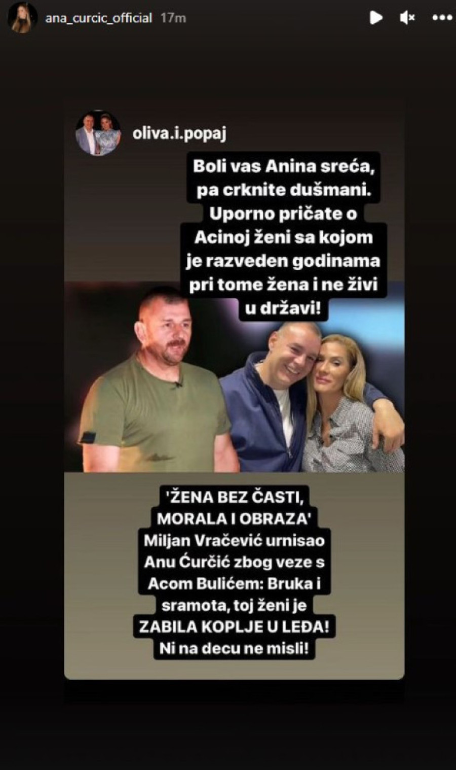 - Boli vas Anina sreća, pa crknite dušmani. Uporno pričate o Acinoj ženi sa kojom je razveden godinama, pritom žena i ne živi u državi - pisalo je.