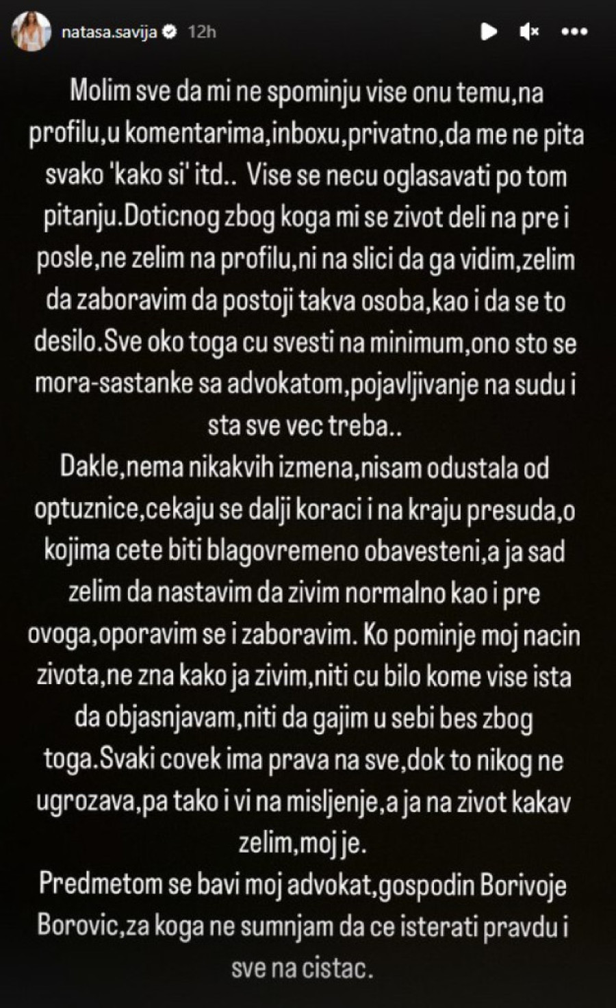 - Molim sve da mi ne spominju više onu temu, na profilu, u komentarima, inboksu, privatno, da me ne pita svako 'kako si' itd.. Više se neću oglašavati po tom pitanju. Dotičnog, zbog koga mi se život deli na pre i posle, ne želim na profilu, ni na slici da ga vidim. Želim da zaboravim da postoji takva osoba, kao i da se to desilo. Sve oko toga ću svesti na minimum, ono što se mora - sastanke sa advokatom, pojavljivanje na sudu i šta sve već treba - napisala je ona.