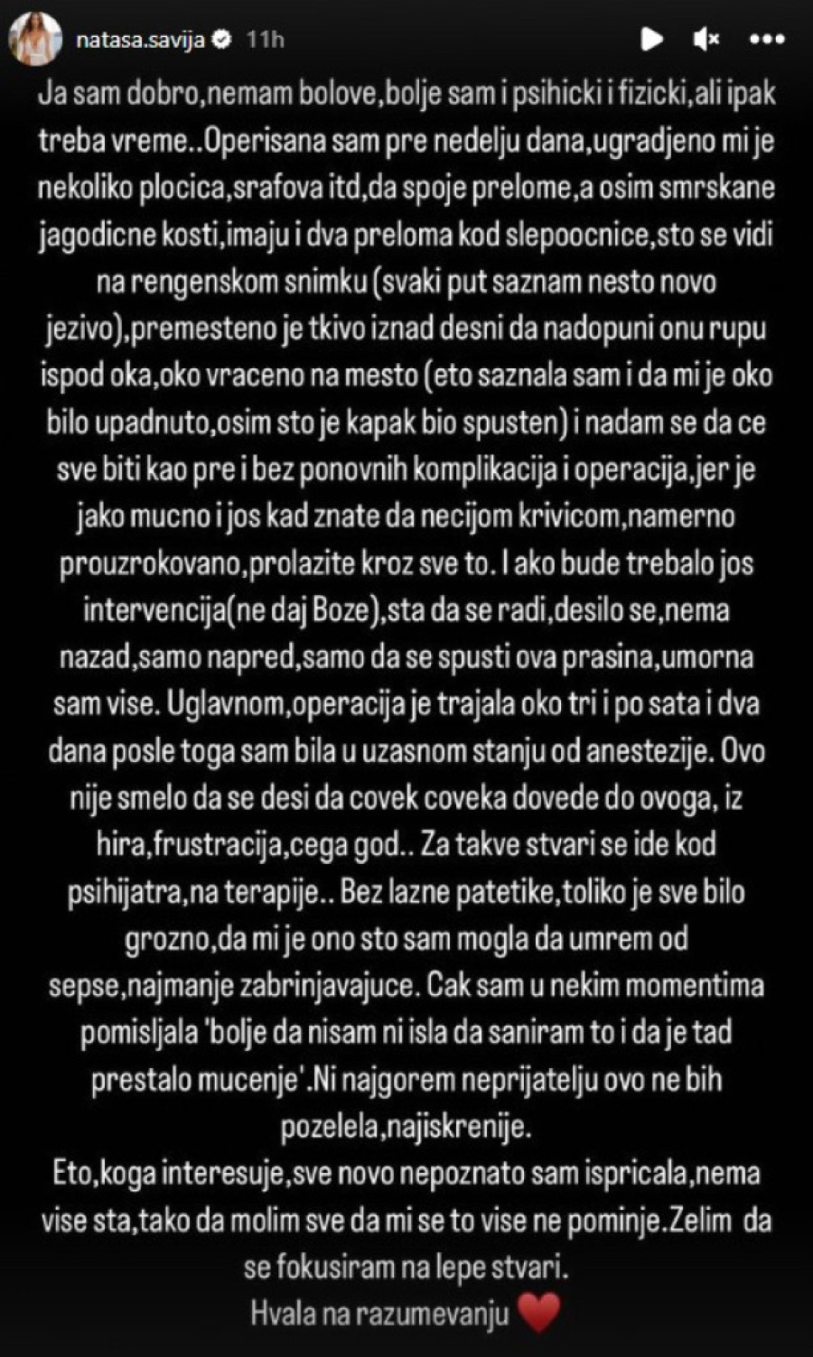 - I ako bude trebalo još intervencija (ne daj Bože), ta da se radi, desilo se, nema nazad, samo napred, samo da se spusti ova prašina, umorna sam više. Uglavnom, operacija je trajala oko tri i po sata i dva dana posle toga sam bila u užasnom stanju od anestezije. Ovo nije smelo da se desi da čovek čoveka dovede do ovoga, iz hira, frustracija, čega god.. Za takve stvari se ide kod psihijatra, na terapije.. Bez lažne patetike, toliko je sve bilo grozno, da mi je ono što sam mogla da umrem od sepse najmanje zabrinjavajuće. Čak sam u nekim momentima pomišljala 'Bolje da nisam ni išla da saniram to i da je tad prestalo mučenje'. Ni najgorem neprijatelju ovo ne bih poželela, najiskrenije. Eto, koga interesuje, sve novo nepoznato sam ispričala, nema više šta, tako da molim sve da mi se to više ne pominje. Želim da se fokusiram na lepe stvari. Hvala na razumevanju - napisala je Šavija na svom Instagram profilu.