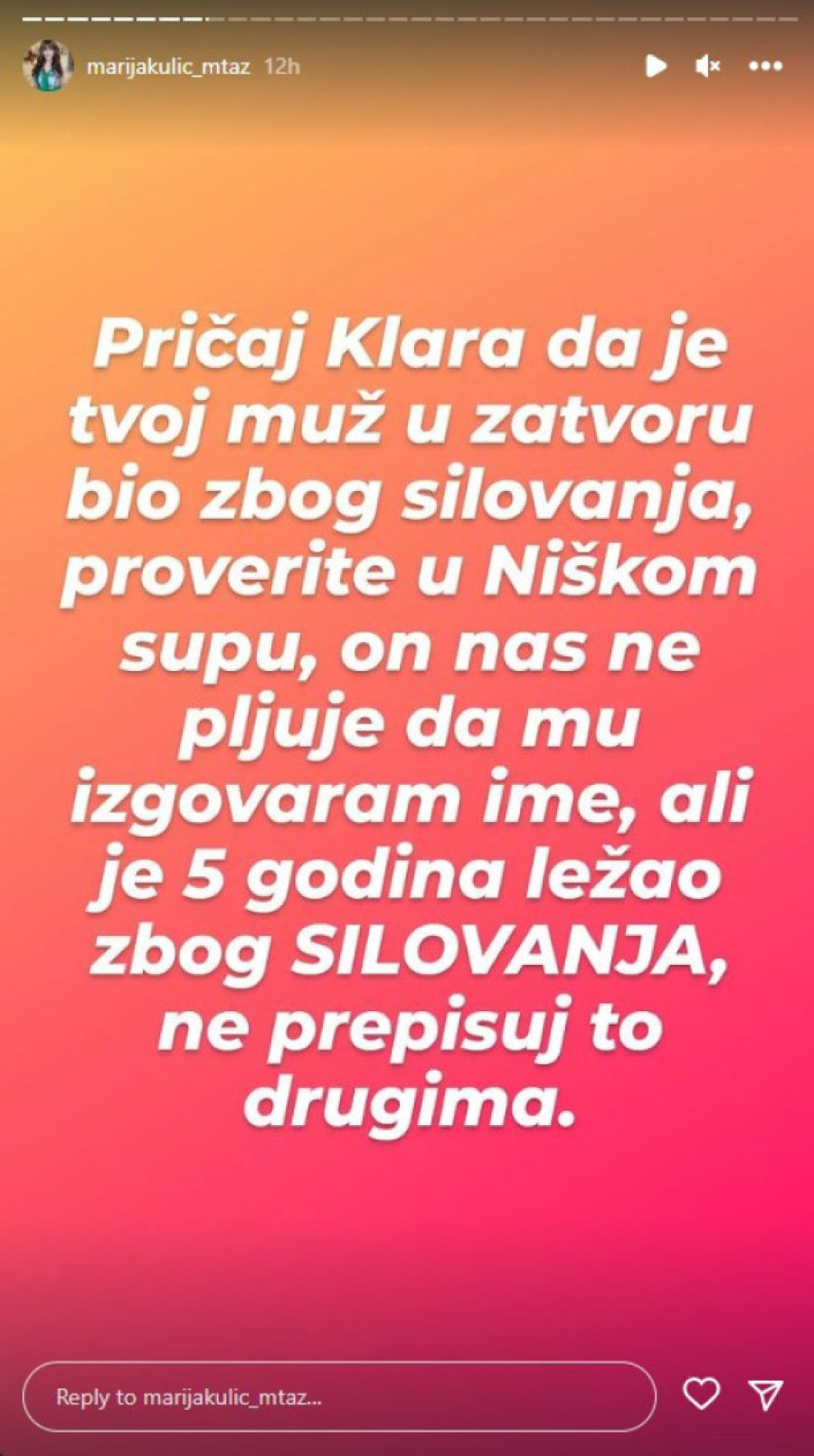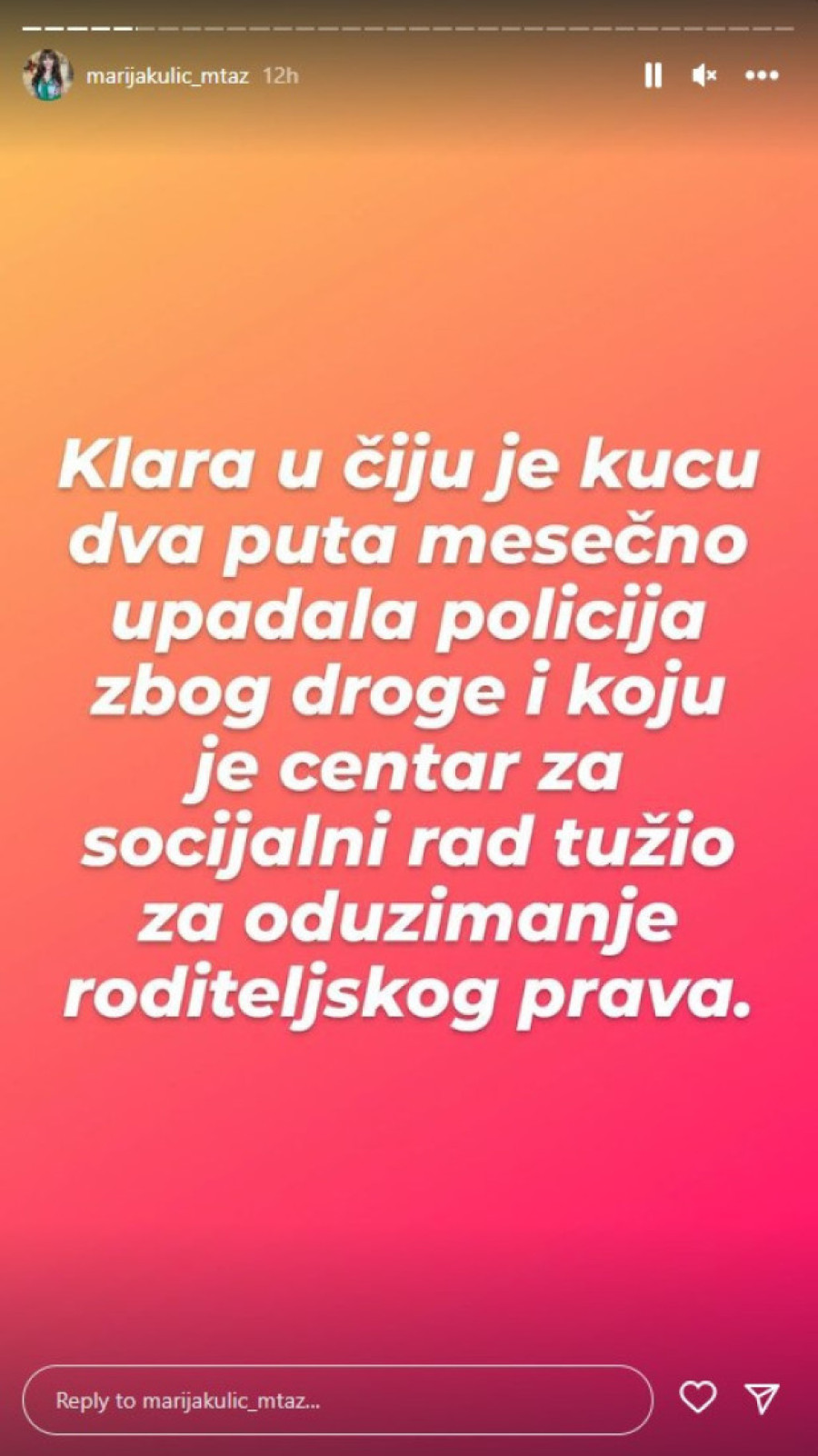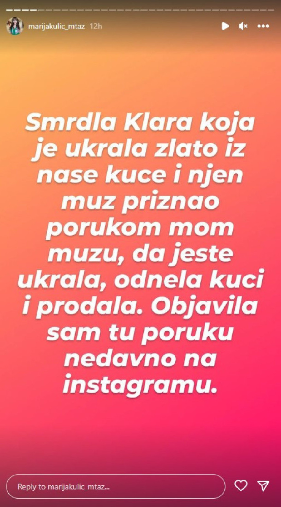 - Živa je ona Klara za koju je sudija rekla da je za njom raspisana poternica zbog mnogih dela. Još u "Zadruzi" mi je rekla da se sprema da pobegne iz Srbije, ona kao Makedonka jer je centar za socijalni rad tući za oduzimanje roditeljskog prava. Klara čiji je malolteni sin privođen i hapšen zbog prodaje narkotika deci po osnovnim školama i od toga najgora porodica u Nišu živela godinama, trujući tuđu decu. Smrdla Klara koja je ukrala zlato iz naše kuće i njen muž priznao porukom mom mužu da jeste ukrala, odnela kući i prodala. Objavila sam tu poruku nedavno na Instagramu. Klara u čiju je kuću dva puta mesečno upadala policija zbog droge i koju je centar za socijalni rad tužio za oduzimanje roditeljskog prava - pisala je ona, pa nastavila:
