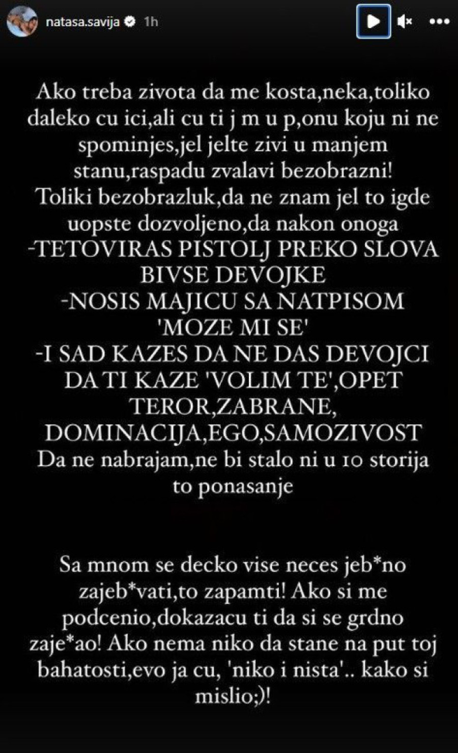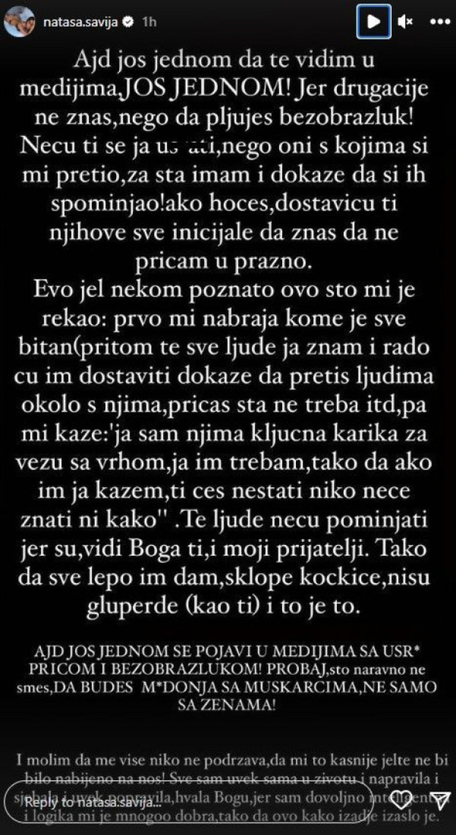 - ...Hajde još jednom da te vidim u medijima, još jednom! Jer drugačije ne znaš, nego da pljuješ, bezobrazluk! Neću ti se ja u*rati, nego oni s kojima si mi pretio, za šta imam i dokaze da si ih spominjao! Ako hoćeš, dostaviću ti njihove sve inicijale da znaš da ne pričam u prazno. Evo, da li je nekom poznato ovo što mi je rekao: prvo mi nabraja kome je sve bitan; pritom te sve ljude ja znam i rado ću im dostaviti dokaze da pretiš ljudima okolo s njima, pričaš šta ne treba... Pa mi kaže: „Ja sam njima ključna karika za vezu sa vrhom, ja im trebam, tako da ako im ja kažem, ti ćeš nestati niko neće znati ni kako". Te ljude neću pominjati jer su vidi Boga ti i moji prijatelji. Tako da sve lepo im dam, sklope kockice, nisu gluperde (kao ti) i to je to. I molim da me više niko ne podržava, da mi to kasnije jelte ne bi bilo nabijeno na nos! Sve sam uvek sama u životu i napravila i sj*bala i uvek popravila, hvala Bogu, jer sam dovoljno inteligentna i logika mi je mnogo dobra, tako da ovo kako izađe izašlo je - poručila je u okviru svojih „storija" ona.