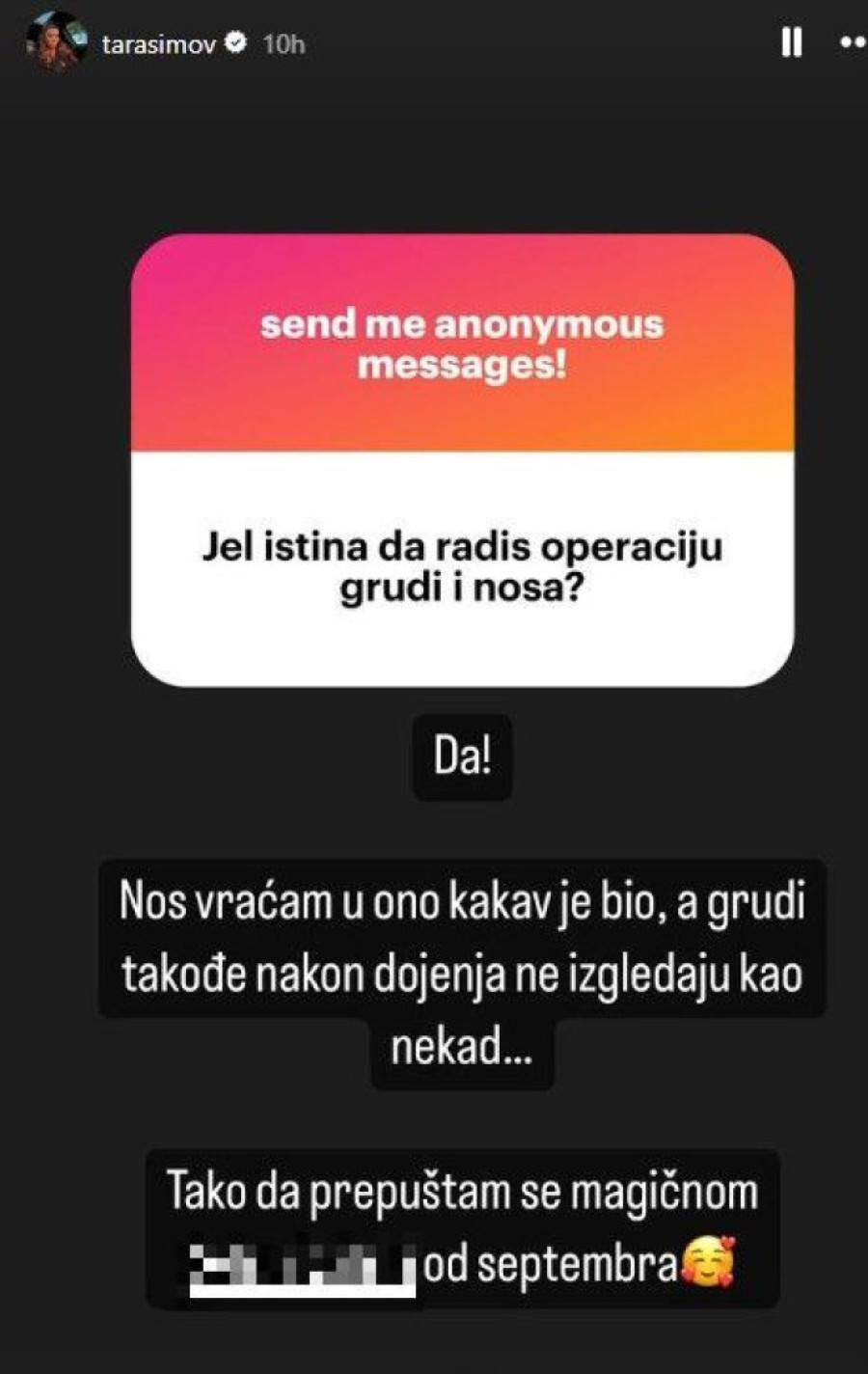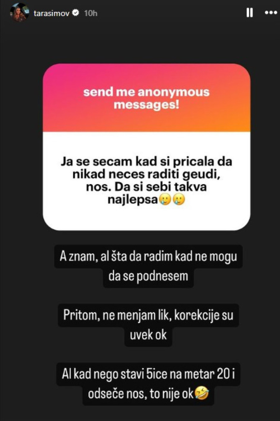 - Nos vraćam u ono kakav je bio, a grudi takođe nakon dojenja ne izgledaju kao nekad. Tako da se prepuštam magičnom doktoru od septembra - napisala je Tara u odgovoru fanovima, pa dodala da, iako je ranije pričala da neće raditi ništa, to sad mora da učini: