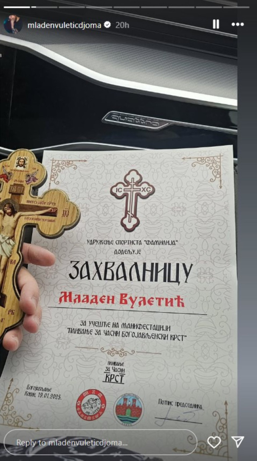 Mladen je pokazao svoju posvećenost tradiciji i veri, a na društvenim mrežama podelio fotografiju sa zahvalnicom koju je dobio za učešće.