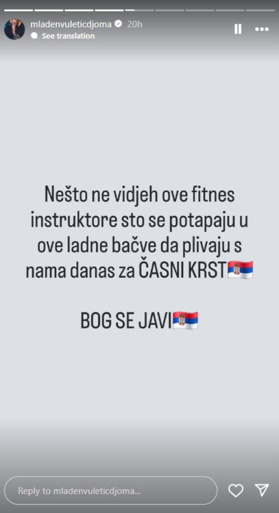 Međutim, ono što je izazvalo pažnju bio je Mladenov Instagram stori na kojem je, uz humorističku provokaciju, komentarisao fitnes instruktore koji praktikuju hladne terapije.