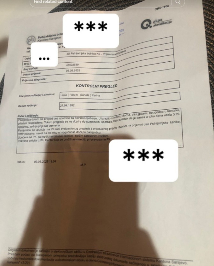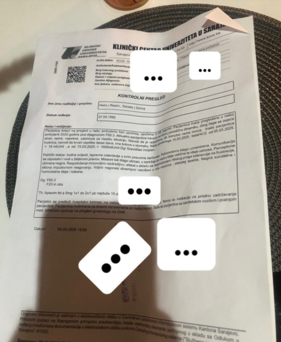Ona je pre nekoliko dana hospitalizovana, a sada je isplivala i fotografija uputa iz Kliničkog centra u Sarajevu, gde je ona u panici došla.