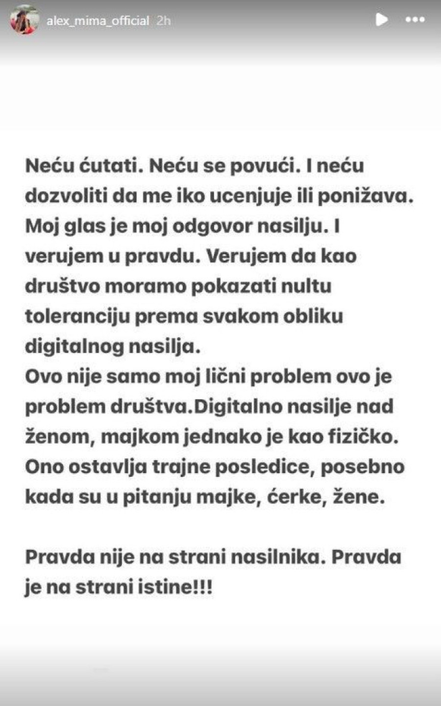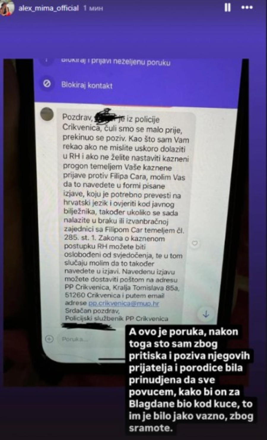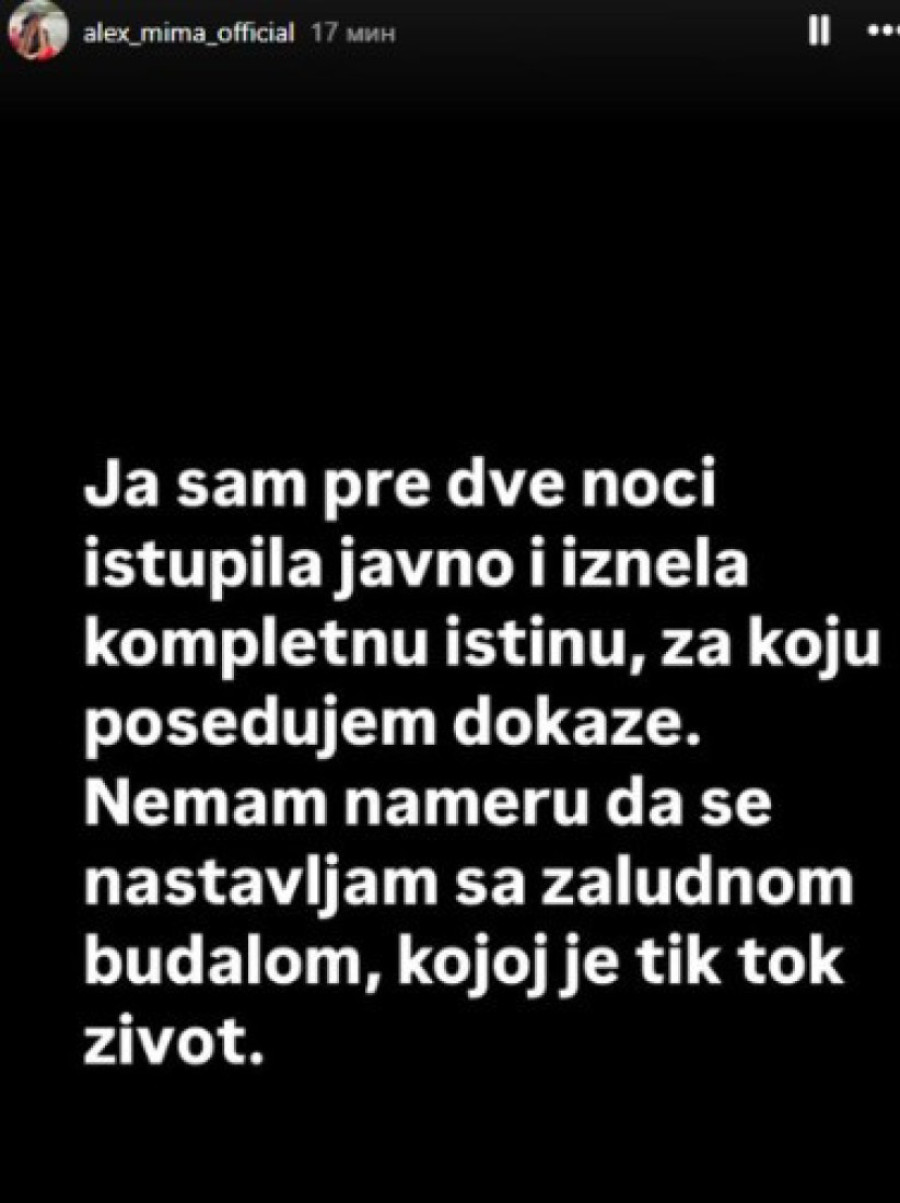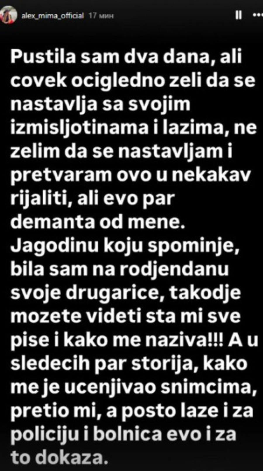 - Pustila sam ga dva dana, ali čovek očigledno ne želi da se zaustavi sa svojim lažima. Ta Jagodina koju spominje, bila sam na rođendanu kod drugarice, a u porukama možete videti kako me naziva i šta mi je sve pisao. U sledećih par storija se vidi kako me je ucenjivao i kako me je nazivao, a pošto laže i za policiju i za bolnicu, evo dokaza - napisala je prvo Aleks, nakon čega je sve poruke objavila.