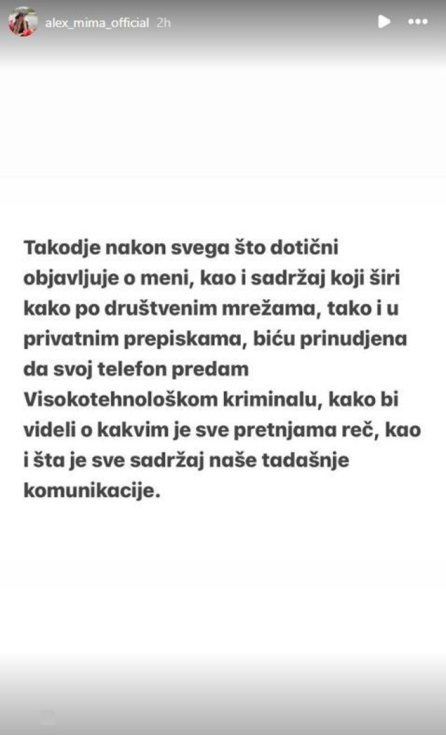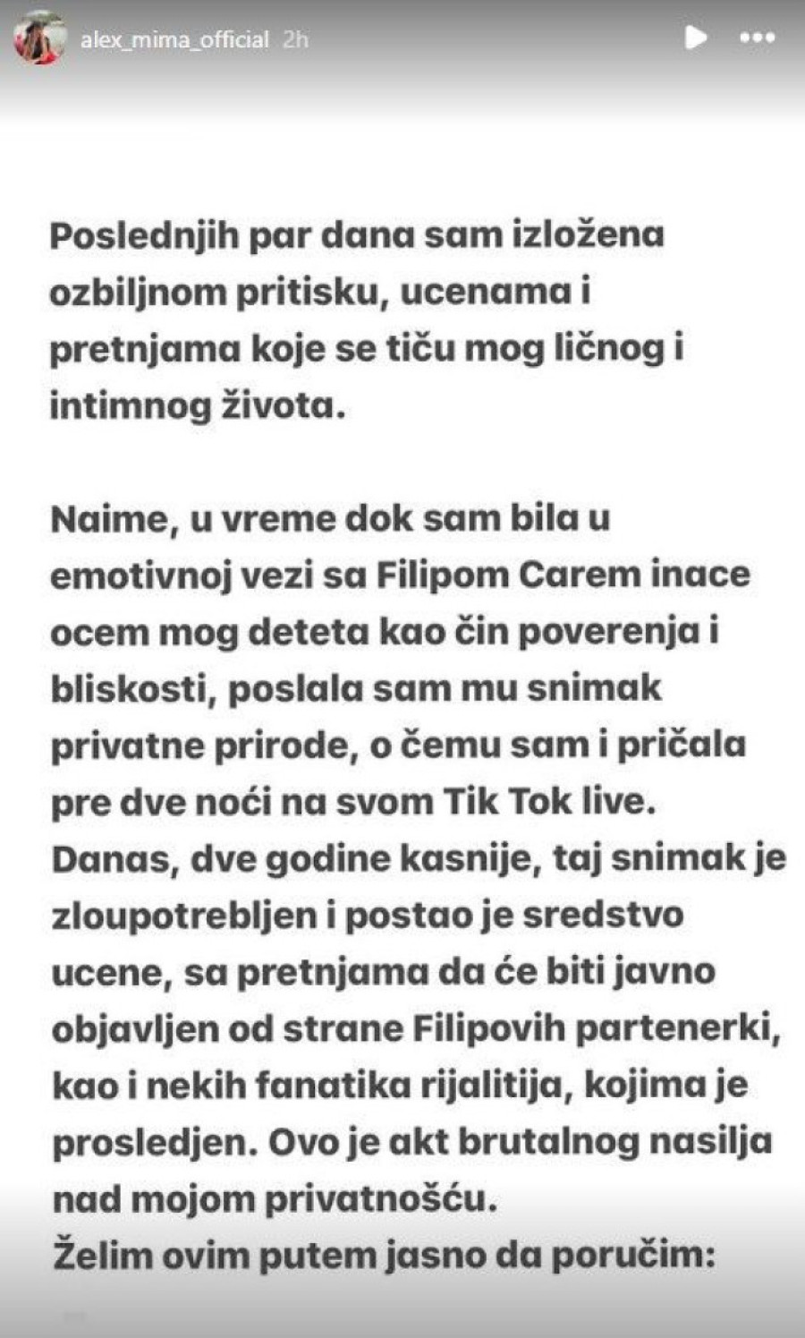 Inače, Aleksandrin eksplicitni snimak navodno imaju tri osobe, o čemu je i sama ranije pričala, a koji je navodno Car pokazivao drugima.