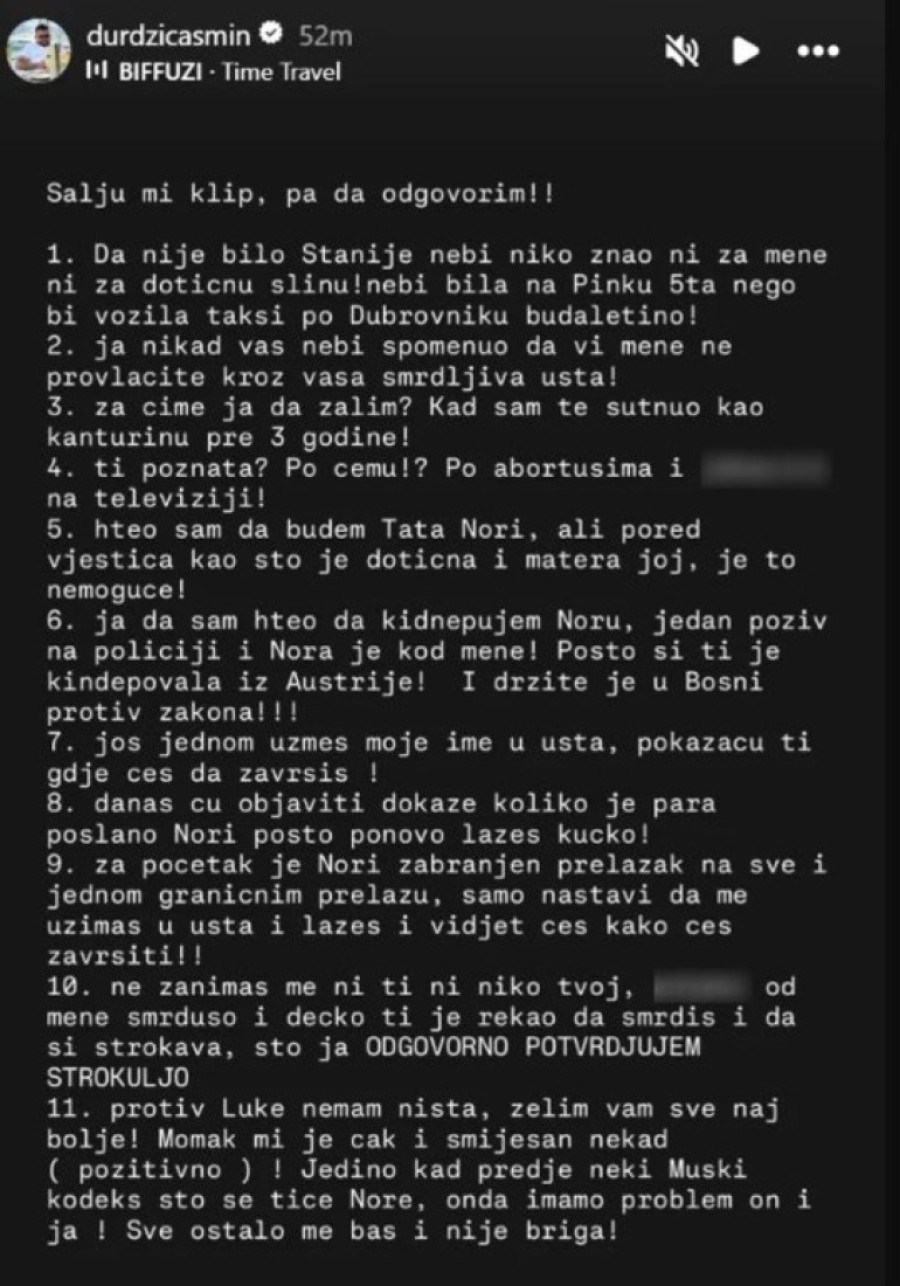 - I još nešto, treba da budeš zahvalna Staniji i da joj svakog dana... ljubiš i zahvaljuješ se Bogu. Jer Stanija meni ne dozvoljava 90 posto stvari koje bih ja inače radio, hodala bi unazad i ti i mater ti! Budaletino glupa, bezobrazna. I sad marš i živi svoj život i nemoj u svakom snimanju o meni da pričaš po 10 minuta, još jednom li me spomeneš, neće ti biti dobro narednih 15 godina - poručio je Asmin.