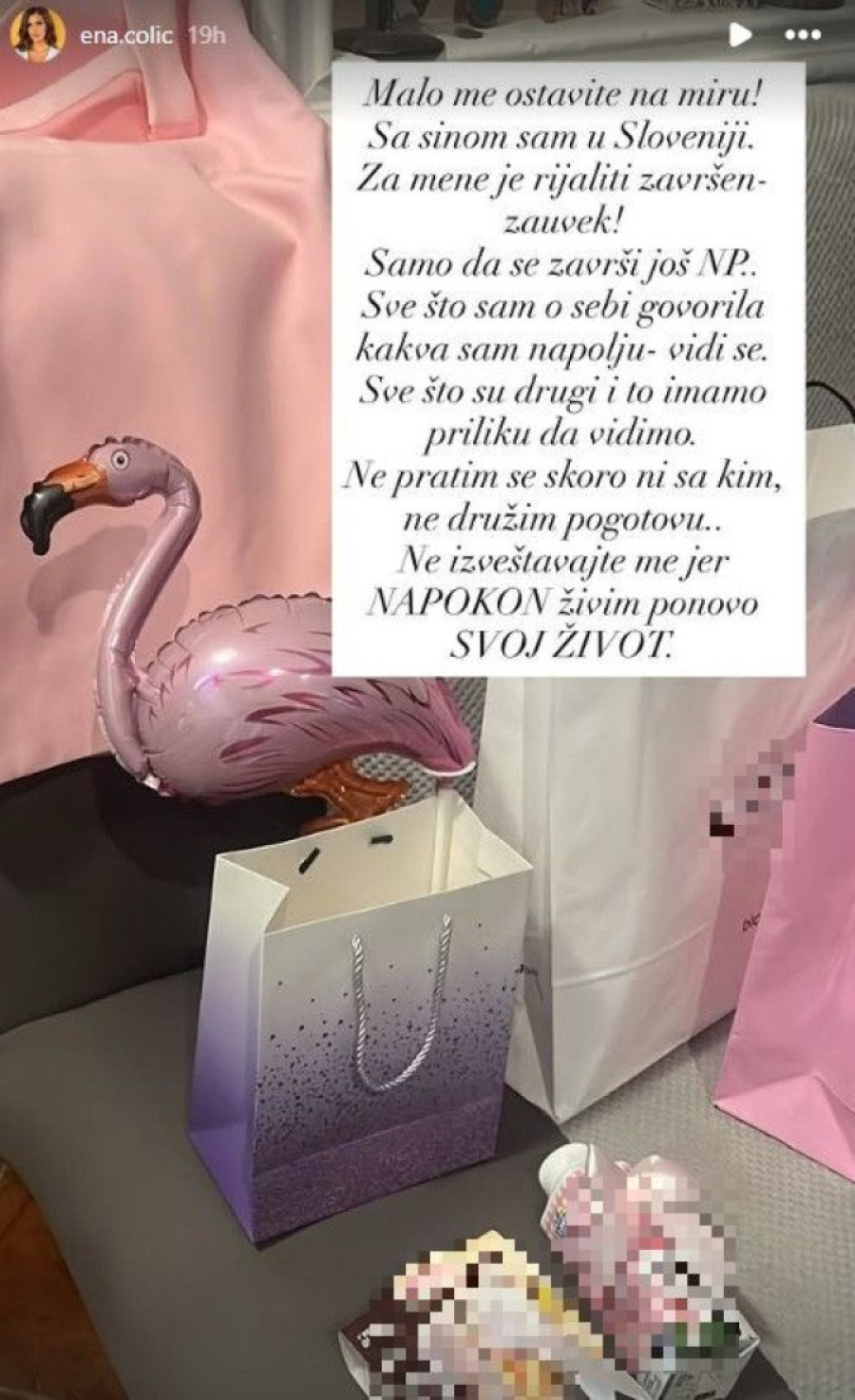 - Malo me ostavite na miru. Sa sinom sam u Sloveniji. Za mene je rijaliti završen, zauvek... Sve što sam o sebi govorila, kakva sam napolju, vidi se. Sve što su drugi i to imamo priliku da vidimo. Ne pratim se skoro ni sa kim, ne družim, pogotovu... - pisala je Ena u okviru svojih "storija".