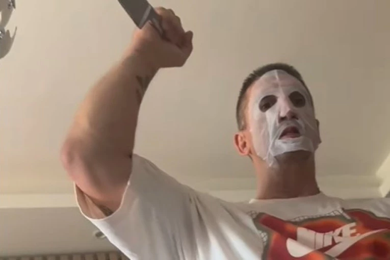 Supruga Kristijana Golubovića, Kristna Spalević, objavila je na Instagramu zaprepašćujući video-snimak u kom pobednik "Farme" hoda s maskom na licu, dok mu je u ruci veliki kuhinjski nož.