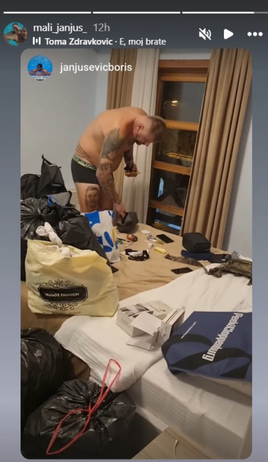Ovaj put, Janjuš je ozbiljno pristupio svom ulasku - spakovao je čak 14 crnih kesa sa stvarima koje će uneti u rijaliti, a prizor kada je ušao u svoju sobu, samo u donjem vešu, snimio je njegov brat, Boris. Na snimku je Boris stavio pesmu Tome Zdravkovića "E moj brate", koja je savršeno dopunila veselu atmosferu.