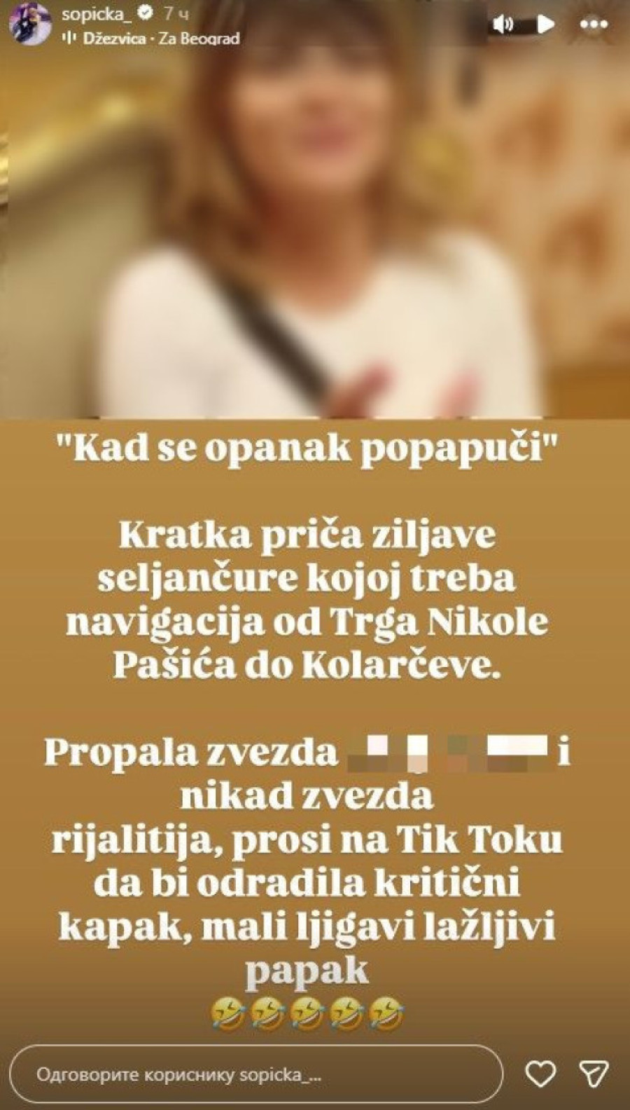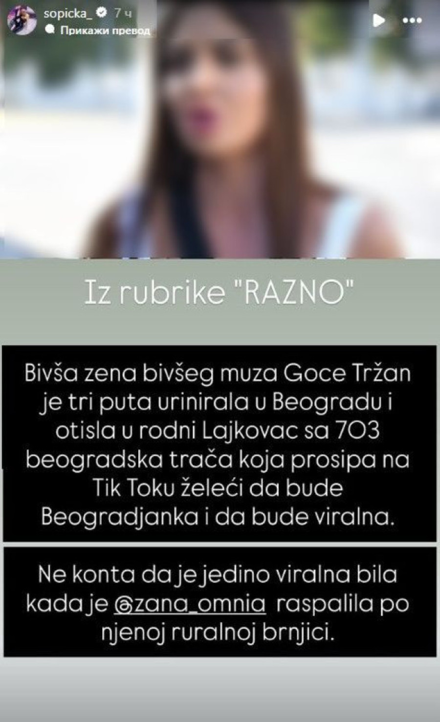- Bivša žena bivšeg muža Goce Tržan je tri puta urinirala u Beogradu i otišla u rodni Lajkovac sa 703 beogradska trača koja prosipa na TikToku, želeći da bude Beograđanka i da bude viralna. Ne konta da je bila viralna jedino kad ju je Žana Omnia raspalila po njenoj ruralnoj brnjici - pisala je Šopićka, što možete videti i u galeriji koja sledi.