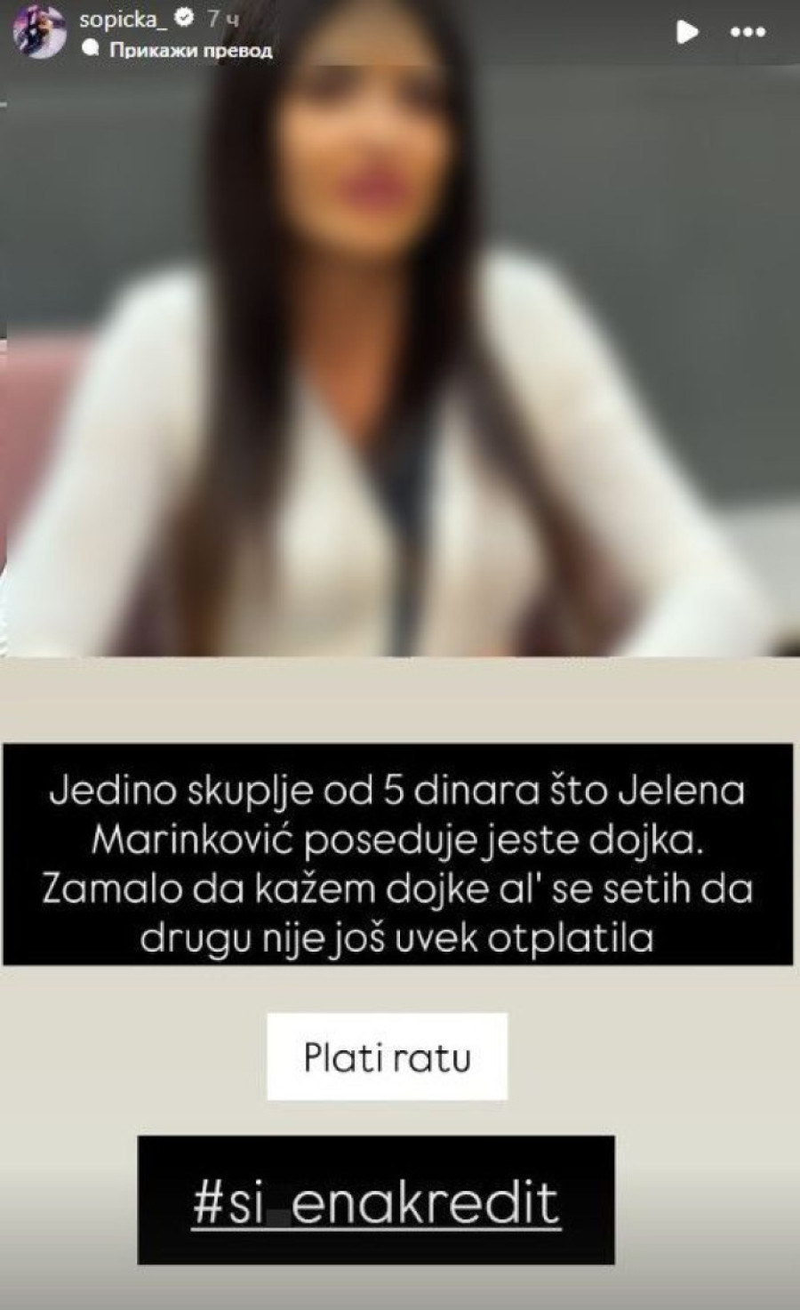 - Jelena Ilić, odnosno Marinković, već duže vreme palamudi po TikToku o meni, ali očigledno nije dosta, pa čeka kao neka babuskera po ceo dan da pita vas, pošto je mi svi kuliramo. To je bivša žena bivšeg muža Goce Tržan. U životu, ja slušam onog ko mi je podario život; moju majku i onog ko mi daje sredstva za život, to su moji nadređeni. Znam da svoj posao radim kako treba i mogu da radim šta hoću, a ona je na TikToku dala sebi malo više za pravo i priča o privatnom životu. Naravno, došla je iz Leskovca, pokupila tri beogradska trača i otišla u selo iz one vuko*ebine, pa upali "lajv", da prosi. Fali joj verovatno da otplati rate za grudi, što joj je Đedović sredio na rate - objašnjavala je u pomenutoj emisiji Šopićka.