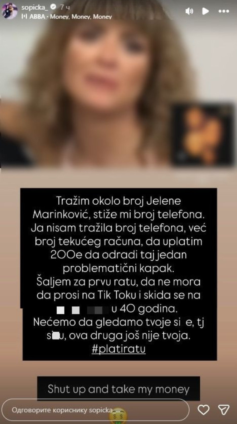 - Tražim okolo broj Jelene Marinković, stiže mi broj telefona. Nisam tražila broj telefona, već broj tekućeg računa, da uplatim 200 evra da odradi taj jedan problematični kapak. Šaljem za prvu ratu, da ne mora da prosi na TikToku i skida se na sajtu za odrasle sa 40 godina. Nećemo da gledamo tvoje s*se, tj. s*su, ova druga još nije tvoja - nastavila je, a između ostalog i dodala kako joj je žao što ju je Jelena blokirala, jer je želela da joj pošalje priručnik naziva "Kako postati Miljana Kulić.