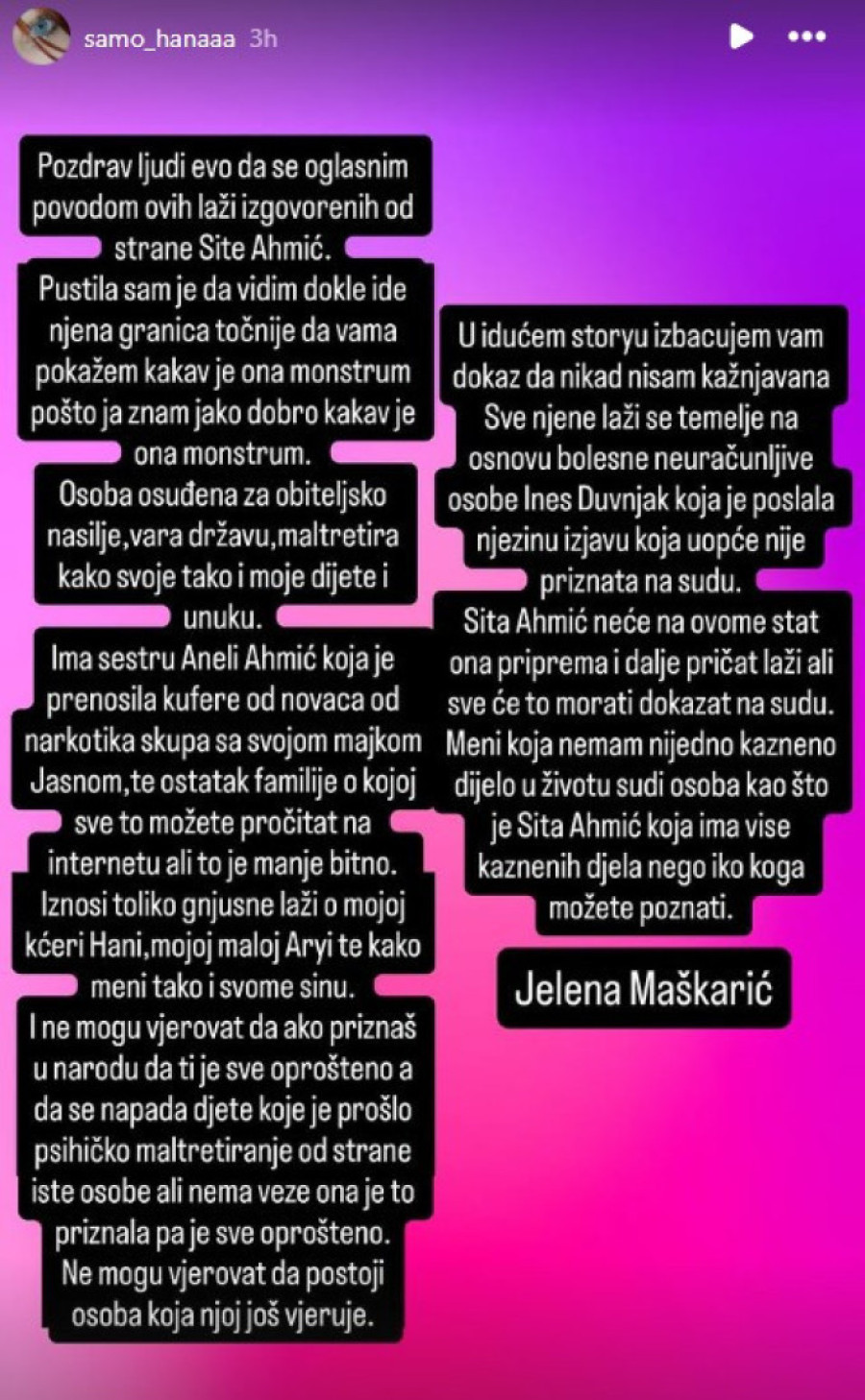 - Pozdrav ljudi, želim da se oglasim povodom laži koje je iznela Sita Ahmić. Pustila sam da vidim dokle ide njena granica, odnosno da vam pokažem kakva je zapravo ona osoba, jer ja znam vrlo dobro kakva je ona, monstrum; osoba je osuđena za porodično nasilje, vara državu i maltretira kako svoju decu, tako i moje dete i unuku. Ima sestru, Aneli Ahmić, koja je prenosila kofere sa novcem od narkotika zajedno sa svojom majkom Jasnom, kao i ostatak porodice o kojoj sve možete pročitati na internetu, ali to nije bitno. Iznosi toliko ogavnih laži o mojoj ćerki Hani, mojoj maloj Ariji, kao i o meni i svom sinu. Ne mogu da verujem da ako nekom priznaš sve u narodu, sve mu se oprosti, a onda se napada dete koje je prošlo kroz psihičko zlostavljanje od iste osobe. Međutim, ona je to priznala i sad je sve oprošteno. Ne mogu da verujem da postoji iko ko joj još uvek veruje - pisala je na Haninom Instagramu ona.