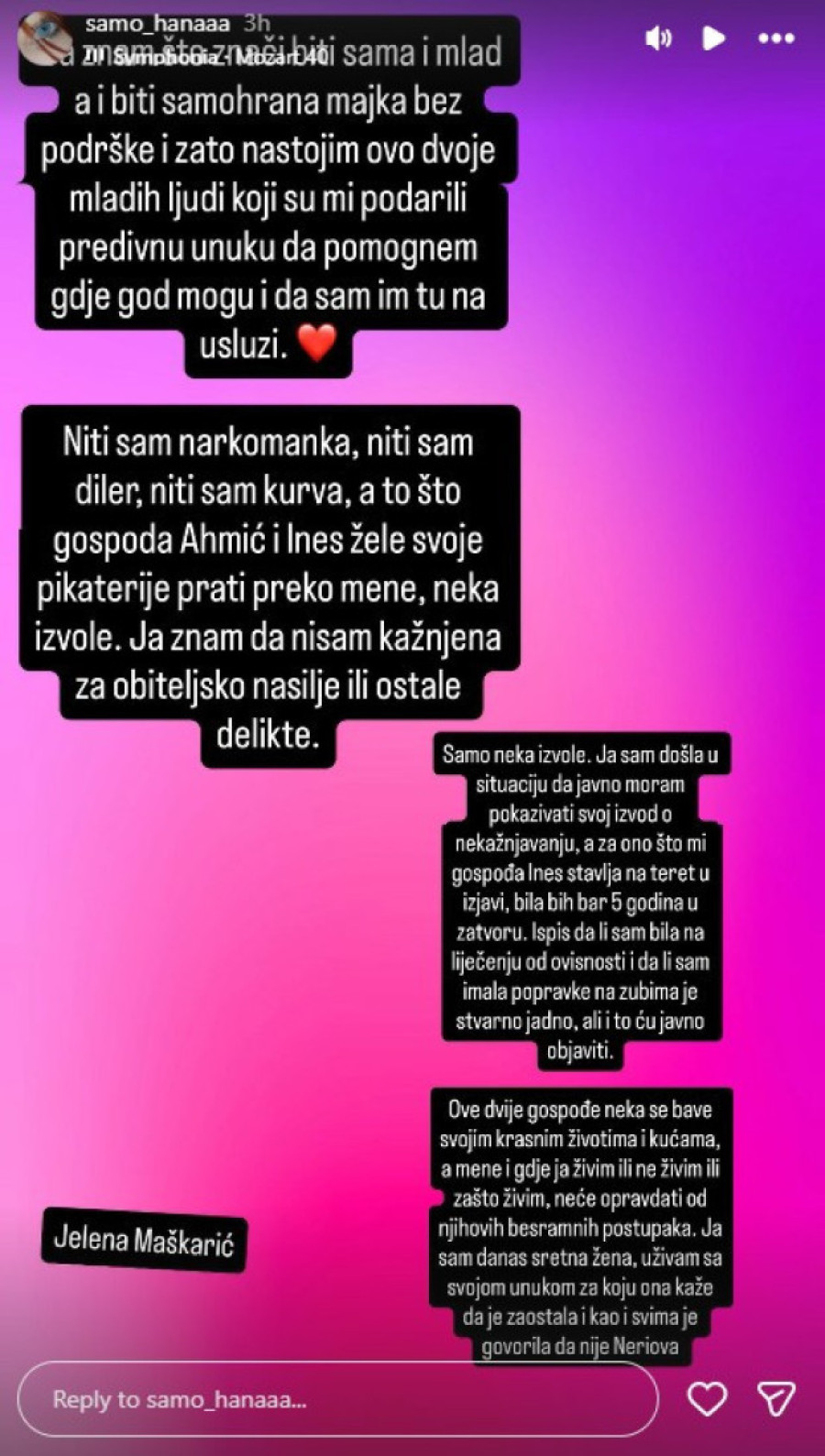 - U sledećem storiju ću objaviti dokaz da nikada nisam kažnjavana. Sve njene laži zasnivaju se na izjavi jedne bolesne, neuračunljive osobe, Ines Duvnjak, koja je poslala izjavu koja uopšte nije priznata na sudu. Sita Ahmić neće ovde stati; ona nastavlja da širi laži, ali sve će morati da dokaže na sudu. Ja, koja nemam nijedno krivično delo u životu, sudim se sa osobom kao što je Sita Ahmić, koja ima više krivičnih dela nego bilo ko koga možete upoznati. Ja znam šta znači biti sama i mlada, a i biti samohrana majka bez podrške, i zato nastojim ovo dvoje mladih ljudi koji su mi podarili predivnu unuku da pomognem gde god mogu i da sam im tu na usluzi - nije se zaustavljala ona, što možete videti i u galeriji koja sledi.