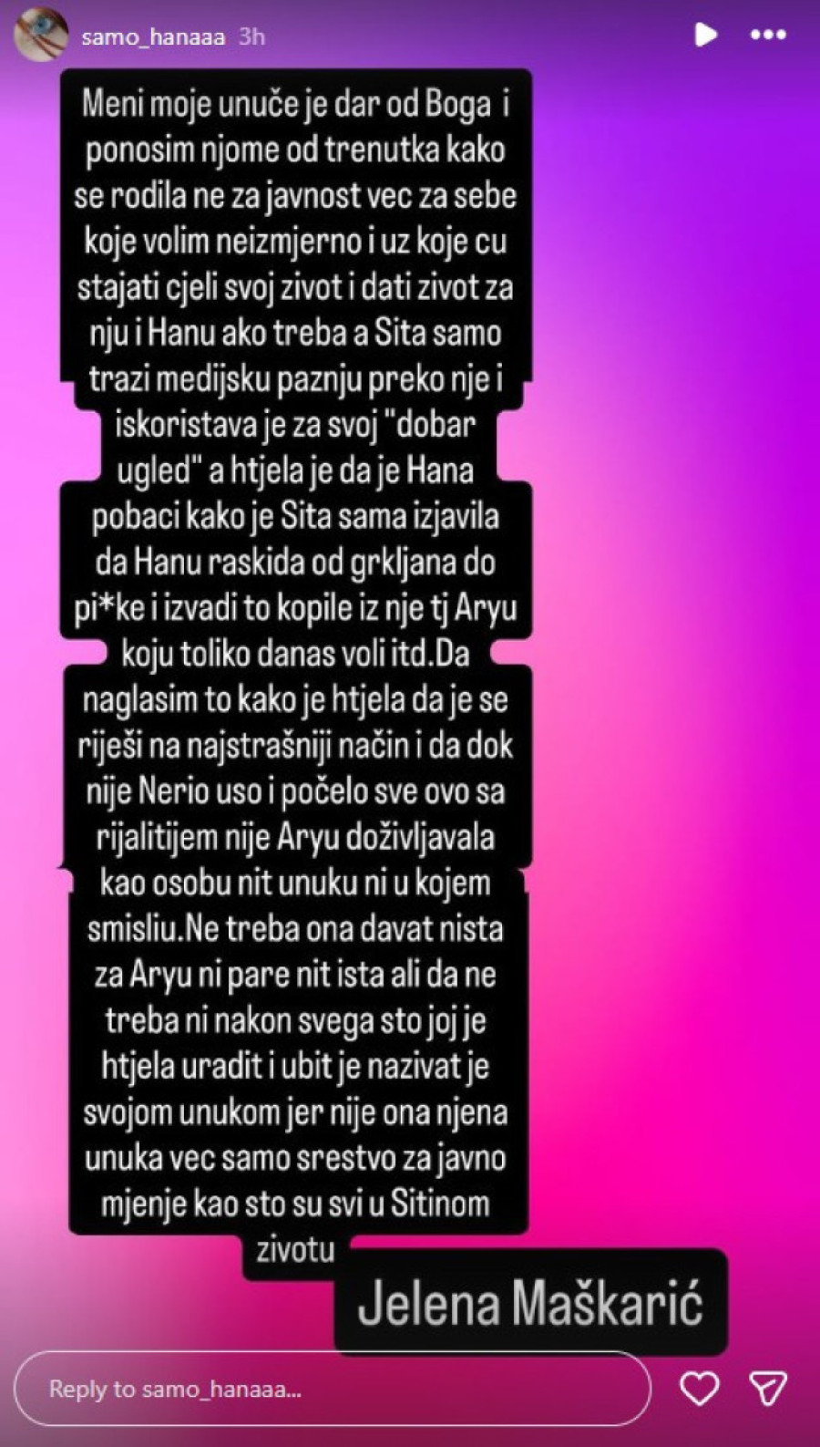 - Sita samo traži medijsku pažnju preko nje i iskorišćava je za svoj "dobar ugled". Htela je da Hana pobaci, kao što je Sita sama izjavila "da Hanu raskida od grkljana do pi*ke i izvadi to kopile iz nje", Ariju, koju danas toliko voli... Da naglasim i to kako je htela da se sve reši na najstrašniji način i da, dok nije Nerio ušao i dok sve ovo sa rijalitijem nije počelo, Ariju nije doživljavala kao osobu, niti kao unuku, ni u kom smislu. Ne treba ona davati ništa za Ariju, ni pare, ni išta, ali ne treba ni, nakon svega što joj je htela uraditi, ubiti je i nazivati je svojom unukom, jer ona nije njena unuka, već samo sredstvo za javno mnjenje, kao što su svi u Sitinom životu - pisala je Jelena, zaključujući rečima kako će se "rijaliti završiti, pa je onda čeka sud ,na kom nema laganja".