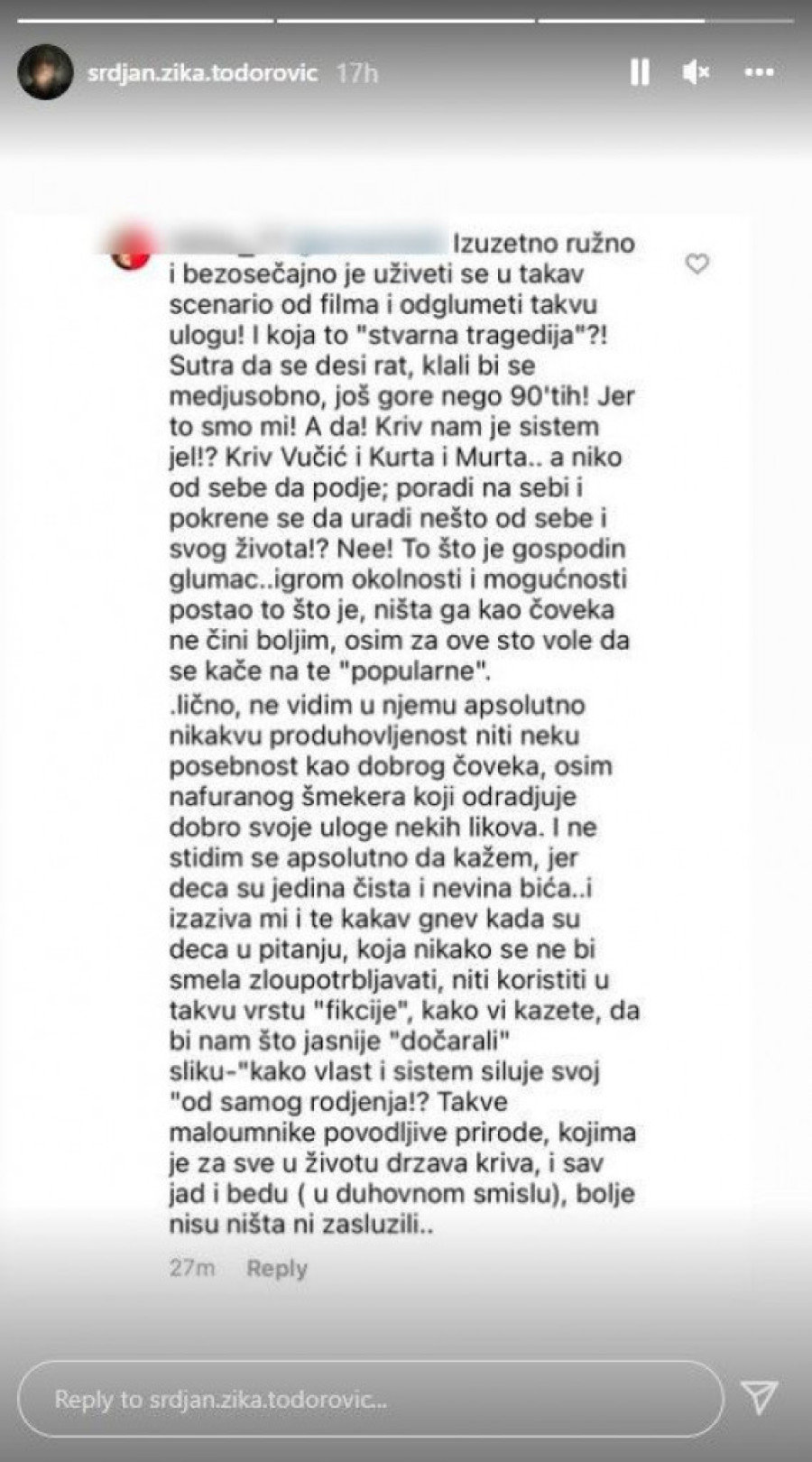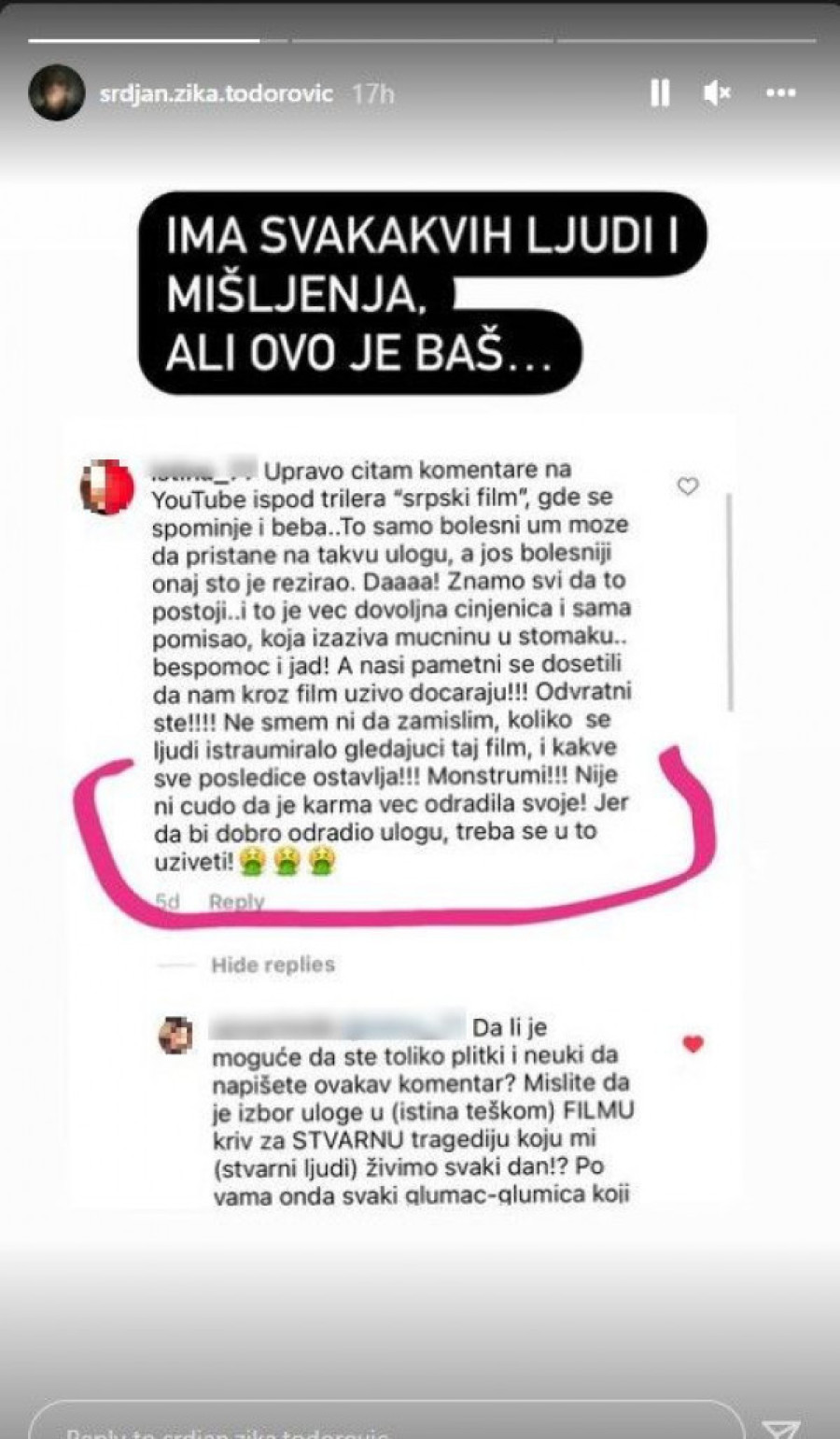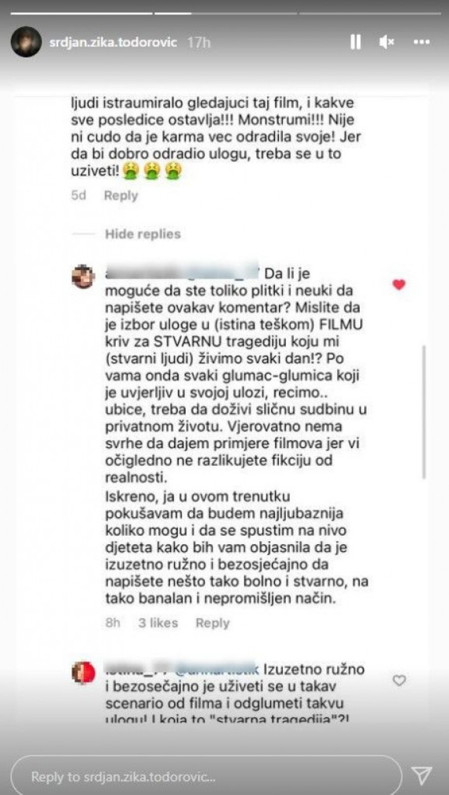 Glumac je na ovakve komentare morao da reaguje, pa je isečke objavio na Instagram storiju, a uz to napisao: