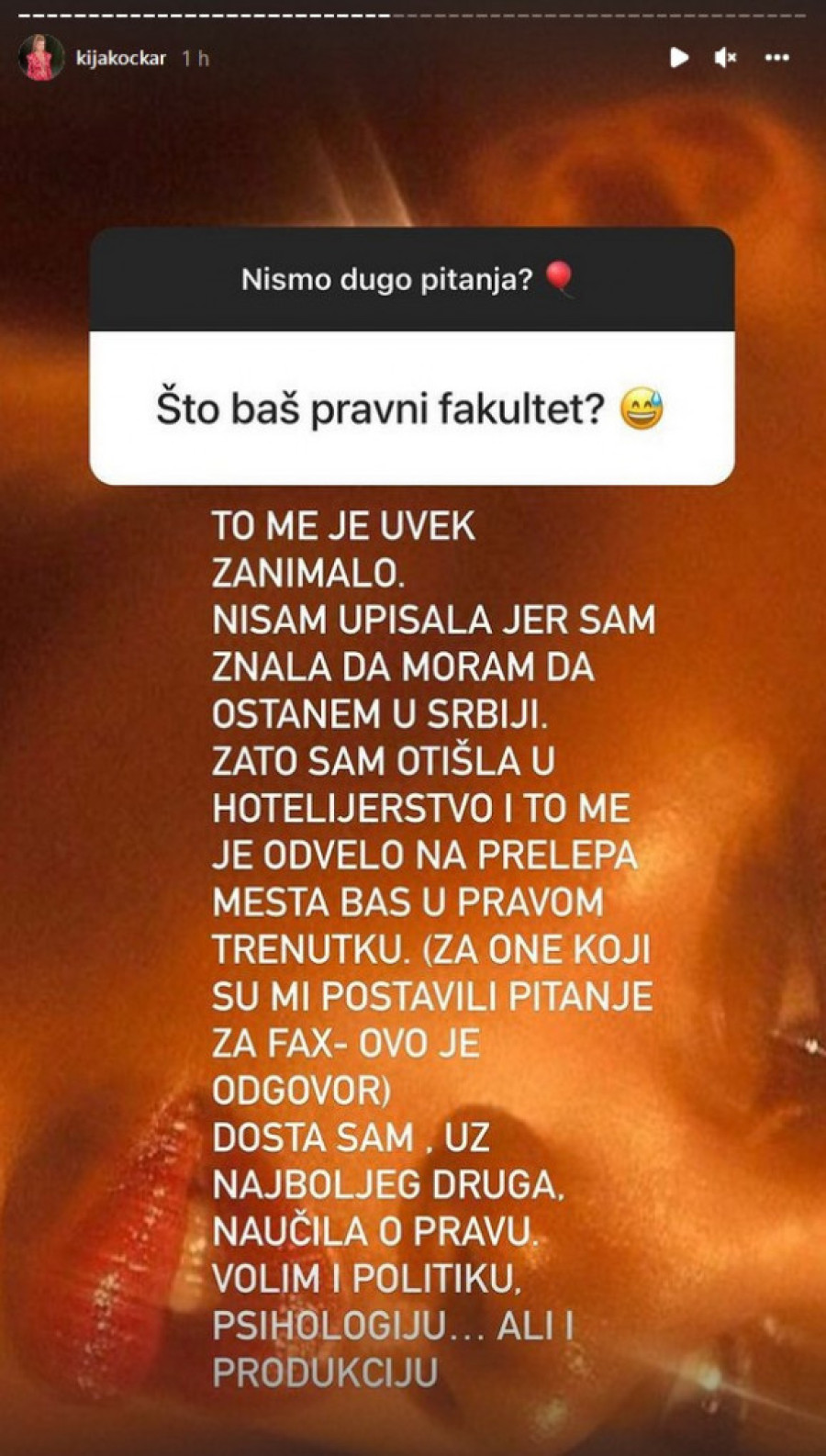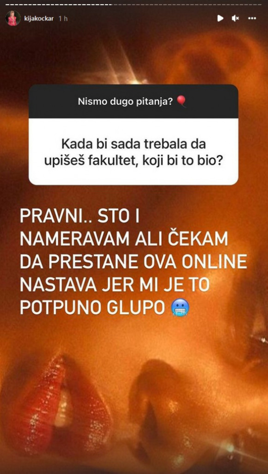 - Pravni... Što i nameravam ali čekam da prestane ova "online" nastava jer mi je to potpuno glupo - poručila je Kija, a na pitanje zašto baš taj fakultet, odgovorila je: