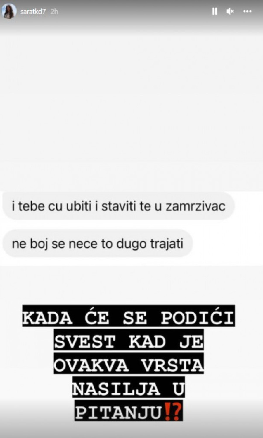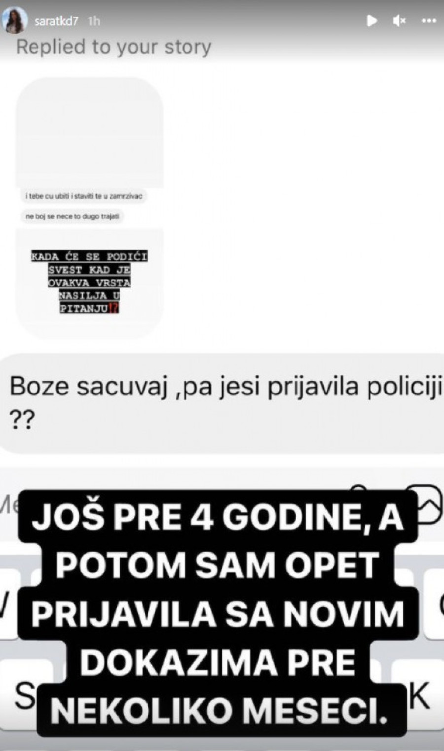 - Citiram rečenicu: "I tebe ću ubiti i staviti u zamrzivač, ne boj se, neće to dugo trajati", bila je samo jedna u nizu od jezivih pretnji. Ista ta osoba je navela da joj je cilj da neko digne ruku na sebe u smislu suicida i mislim da je sada vreme da se priča na tu temu jer nažalost danas se to sve češće dešava posebno kad su mladi u pitanju. Konačno ću progovoriti o slučaju o kom sam dugo ćutala, iako sam povremeno prilikom gostovanja u nekoj od emisija kad smo govorili o sajber nasilju nagovestila da mi kao porodica imamo psihopatu za vratom - počela je Sara.