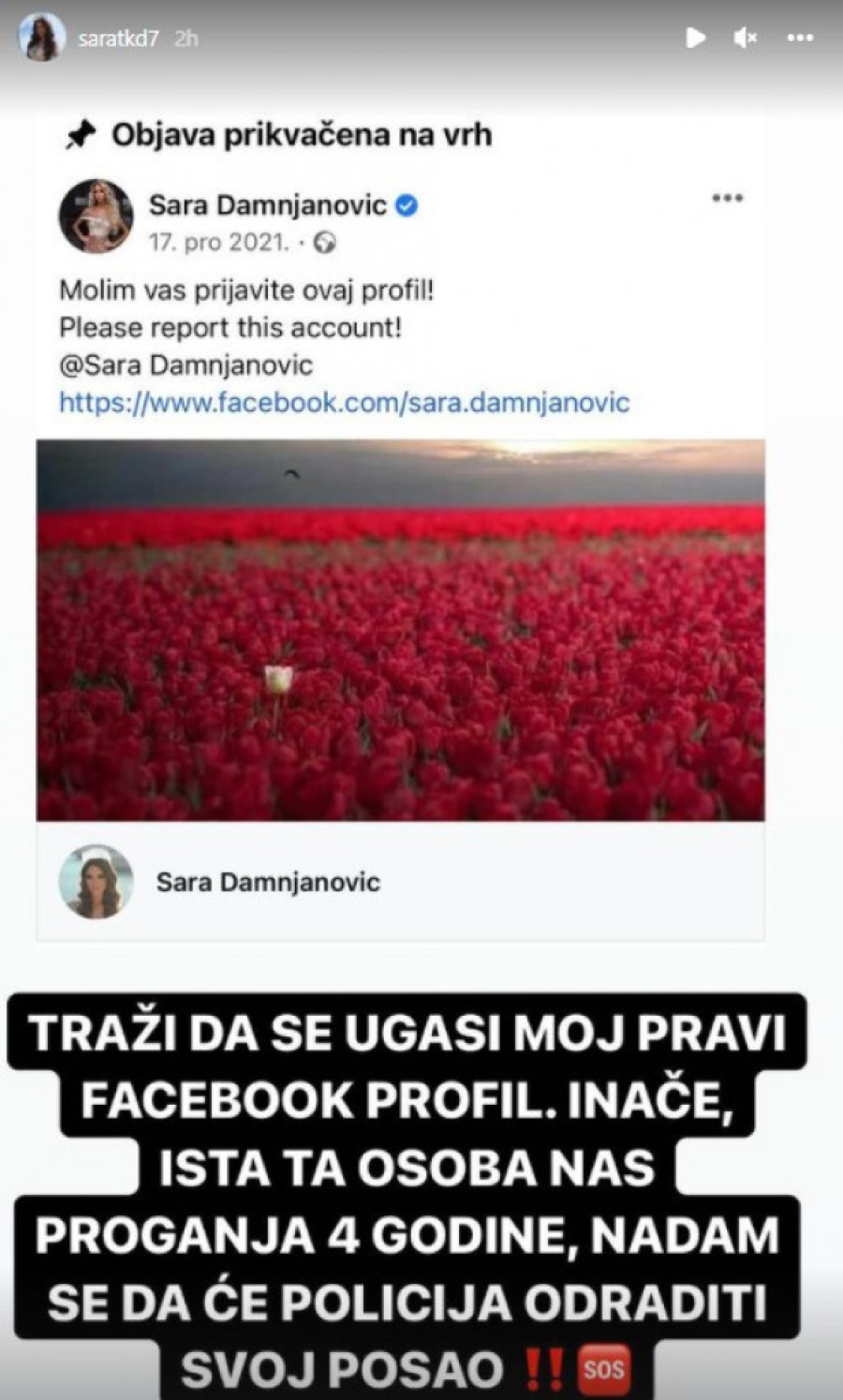 Kako je Sara dalje rekla, ta objava i dalje stoji na profilu, kao i objava koja je prikačena na vrhu profila kao glavna objava gde moli svoje pratioce da prijave i ugase njen pravi FB profil.
