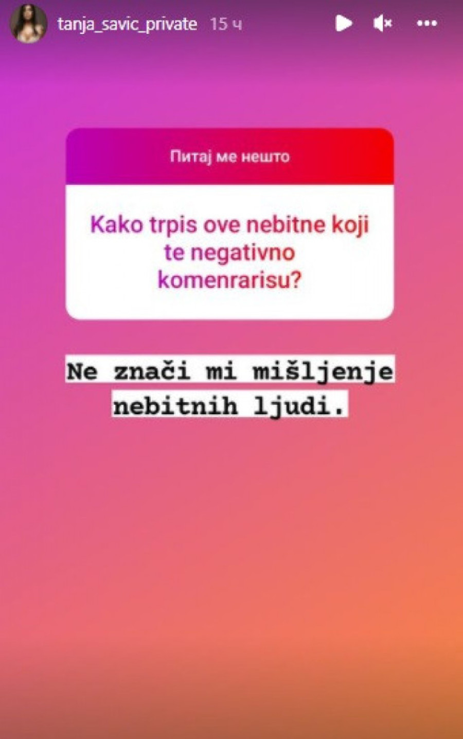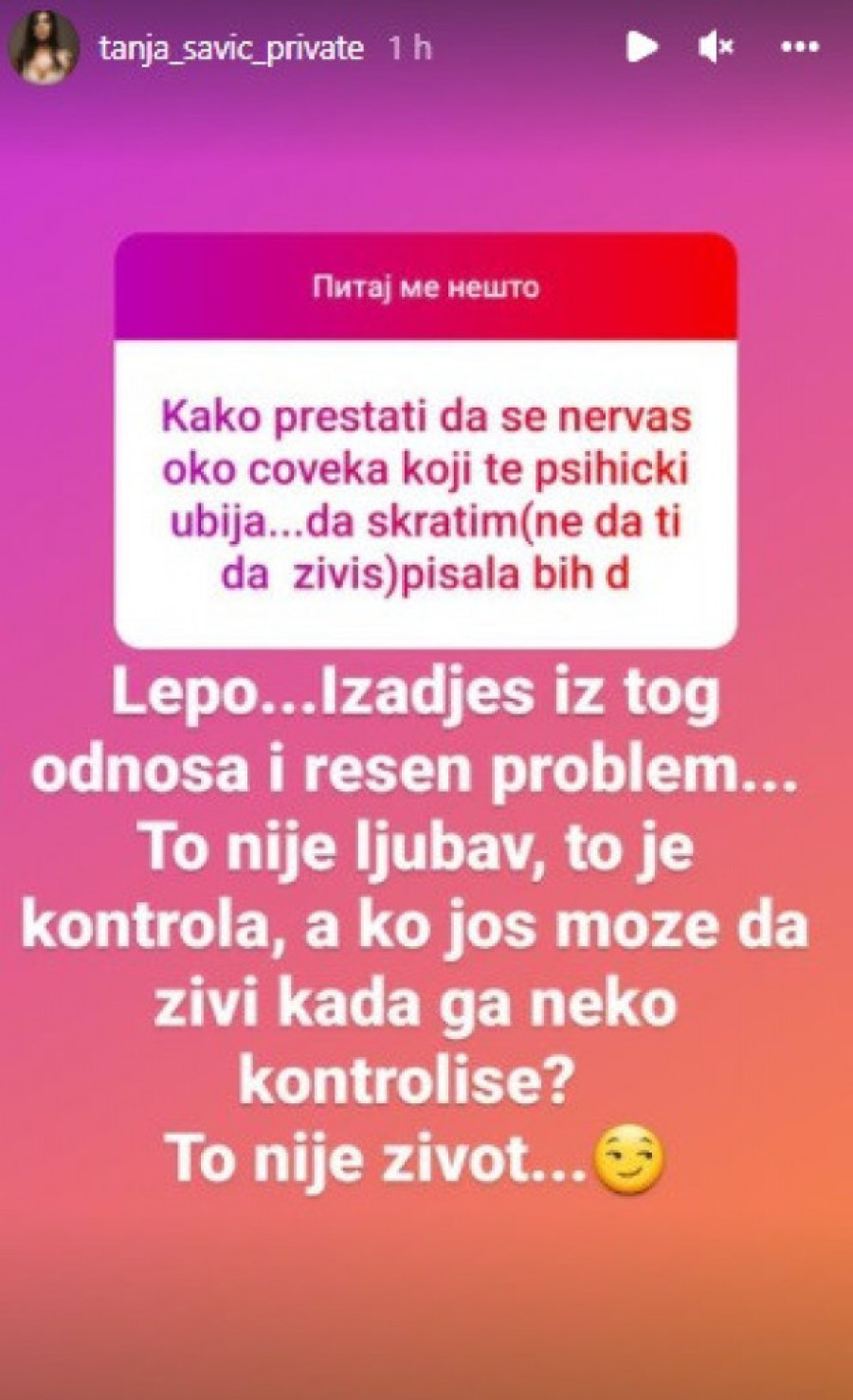 Pevačica Tanja Savić redovna je na društvenim mrežama, putem kojih neretko "ćaska" sa fanovima. Tako je bilo i ovog puta kada im je dala mogućnost da je upitaju šta god žele, a mnoga pitanja koja su joj postavljena ticala su se njene karijere ali i psihičkog balansa i promene koju je napravila nakon agonije kroz koju je prošla sa suprugom Dušanom Jovančevićem.