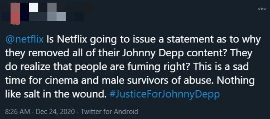 Na društvenim mrežama napravili su oznaku ,,Pravda za Džonija Depa”, te se brojni i javno zapitali – kako to da je on ukinut, a da je njegova bivša Amber ,,preživela”, kada je ,,Netfliks” u pitanju. Pojedini koji glumicu vide kao napasnika smatraju da je sada red i nju da ,,obrišu”, prenose strani mediji, jer u suprotnom neće moći da izbegnu skandal do sada neviđenih razmera.